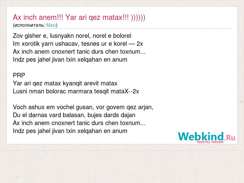 Zov gisher e, lusnyakn norel, norel e bolorel Im xorotik yarn ushacav, tesnes ur e korel — 2x Ax inch anem cnoxnert tanic durs chen toxnum... Indz pes jahel jivan txin xelqahan en anum PRP Yar ari qez matax kyanqit arevit matax Lusni nman bolorac marmara tesqit mataX--2x Voch ashux em vochel gusan, vor govem qez arjan, Du el darnas vard balasan, bujes dards dajan Ax inch anem cnoxnert tanic durs chen toxnum... Indz pes jahel jivan txin xelqahan en anum