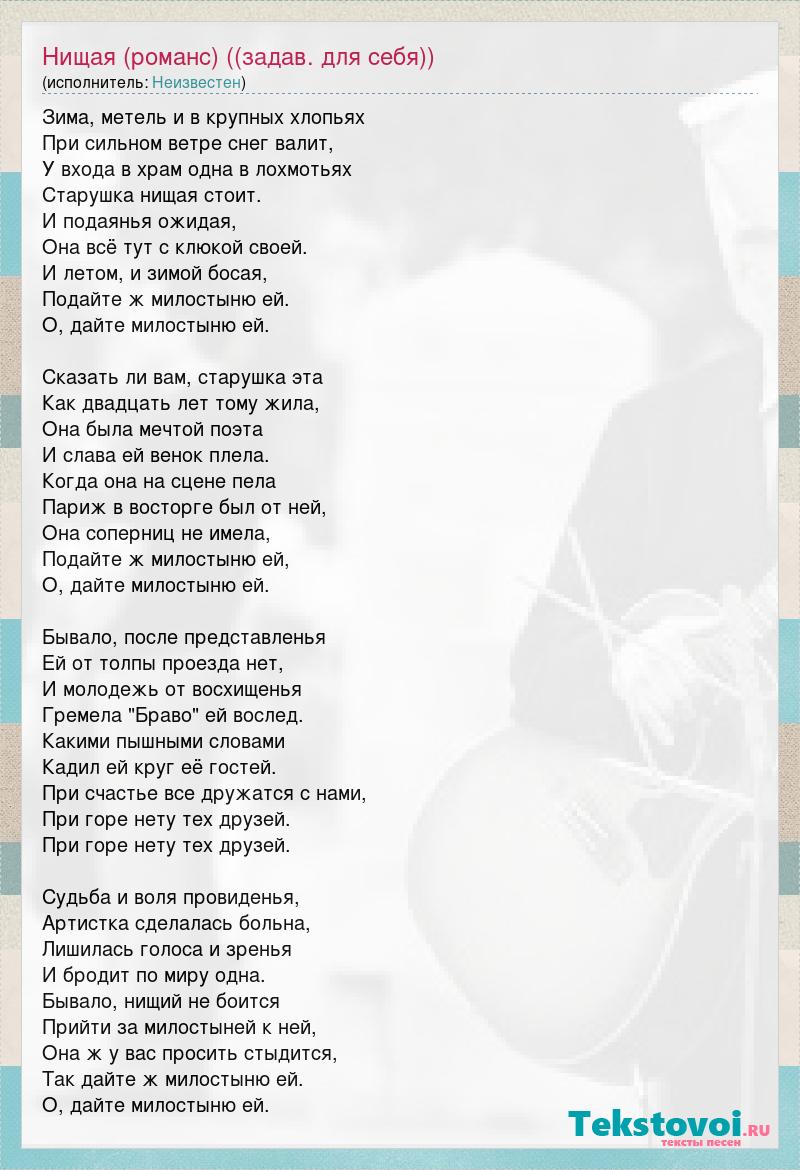 Зима, метель и в крупных хлопьях При сильном ветре снег валит, У входа в храм одна в лохмотьях Старушка нищая стоит. И подаянья ожидая, Она всё тут с клюкой своей. И летом, и зимой босая, Подайте ж милостыню ей. О, дайте милостыню ей. Сказать ли вам, старушка эта Как двадцать лет тому жила, Она была мечтой поэта И слава ей венок плела. Когда она на сцене пела Париж в восторге был от ней, Она соперниц не имела, Подайте ж милостыню ей, О, дайте милостыню ей. Бывало, после представленья Ей от толпы проезда нет, И молодежь от восхищенья Гремела "Браво" ей вослед. Какими пышными словами Кадил ей круг её гостей. При счастье все дружатся с нами, При горе нету тех друзей. При горе нету тех друзей. Судьба и воля провиденья, Артистка сделалась больна, Лишилась голоса и зренья И бродит по миру одна. Бывало, нищий не боится Прийти за милостыней к ней, Она ж у вас просить стыдится, Так дайте ж милостыню ей. О, дайте милостыню ей.