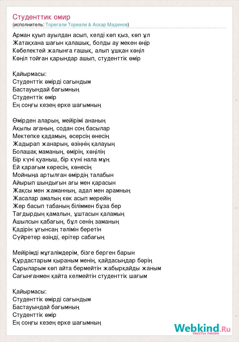 Арман қуып ауылдан асып, келді көп қыз, көп ұл Жатақхана шағын қалашық, болды ау мекен өңір Көбелектей жалынға ғашық, алып ұшқан көңіл Көңіл тойған қарындар ашып, студенттік өмір Қайырмасы: Студенттік өмірді сағындым Бастауындай бағымның Студенттік өмір Ең соңғы кезең ерке шағымның Өмірден аларың, мейірімі ананың Ақылы ағаның, содан соң басылар Мектепке қадамың, өсерсің өнесің Жадырап жанарың, өзіңнің қалауың Болашақ маманың, өмірің, көңілің Бір күні қуаныш, бір күні нала мұң Ей қарағым көресің, көнесің Мойныңа артылған өмірдің талабын Айырып шындығын ағы мен қарасын Жақсы мен жаманның, адал мен арамның Жасалар амалың көк асып мерейің Жер басып табаның біліммен бұза бер Тағдырдың қамалын, ұштасын қаламың Ашылсын қабағың, бұл сенің заманың Қадірін ұғынсаң тәлімін беретін Сүйретер өзіңді, ерітер сабағың Мейірімді мұғалімдерім, бізге берген барын Құрдастарым қыраным менің, қайдасыңдар бәрің Сарыларым көп айта бермейтін жабырқайды жаным Сағынғанмен қайта келмейтін студенттік шағым Қайырмасы: Студенттік өмірді сағындым Бастауындай бағымның Студенттік өмір Ең соңғы кезең ерке шағымның