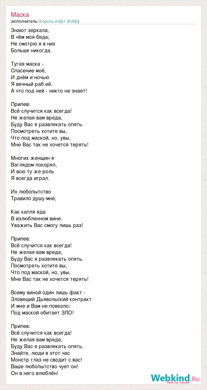 Знают зеркала, В чём моя беда; Не смотрю я в них Больше никогда. Тугая маска - Спасение моё, И днём и ночью Я вечный раб её. А что под ней - никто не знает! Припев: Всё случится как всегда! Не желая вам вреда, Буду Вас я развлекать опять. Посмотреть хотите вы, Что под маской, но, увы, Мне Вас так не хочется терять! Многих женщин я Взглядом покорял, И всю ту же роль Я всегда играл. Их любопытство Травило душу мне, Как капля яда В излюбленном вине. Уважить Вас смогу лишь раз! Припев: Всё случится как всегда! Не желая вам вреда, Буду Вас я развлекать опять. Посмотреть хотите вы, Что под маской, но, увы, Мне Вас так не хочется терять! Всему виной один лишь факт - Зловещий Дьявольский контракт И мне и Вам не повезло: Под маской обитает ЗЛО! Припев: Всё случится как всегда! Не желая вам вреда, Буду Вас я развлекать опять. Знайте, люди в этот час Монстр глаз не сводит с вас! Ваше любопытство чует он! Он в него влюблён!