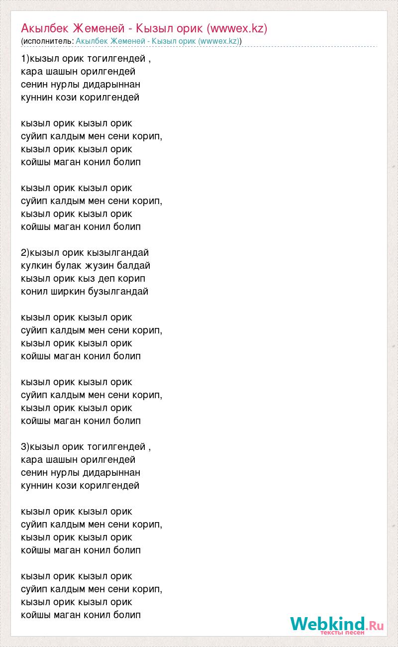 1)кызыл орик тогилгендей , кара шашын орилгендей сенин нурлы дидарыннан куннин кози корилгендей кызыл орик кызыл орик суйип калдым мен сени корип, кызыл орик кызыл орик койшы маган конил болип кызыл орик кызыл орик суйип калдым мен сени корип, кызыл орик кызыл орик койшы маган конил болип 2)кызыл орик кызылгандай кулкин булак жузин балдай кызыл орик кыз деп корип конил ширкин бузылгандай кызыл орик кызыл орик суйип калдым мен сени корип, кызыл орик кызыл орик койшы маган конил болип кызыл орик кызыл орик суйип калдым мен сени корип, кызыл орик кызыл орик койшы маган конил болип 3)кызыл орик тогилгендей , кара шашын орилгендей сенин нурлы дидарыннан куннин кози корилгендей кызыл орик кызыл орик суйип калдым мен сени корип, кызыл орик кызыл орик койшы маган конил болип кызыл орик кызыл орик суйип калдым мен сени корип, кызыл орик кызыл орик койшы маган конил болип