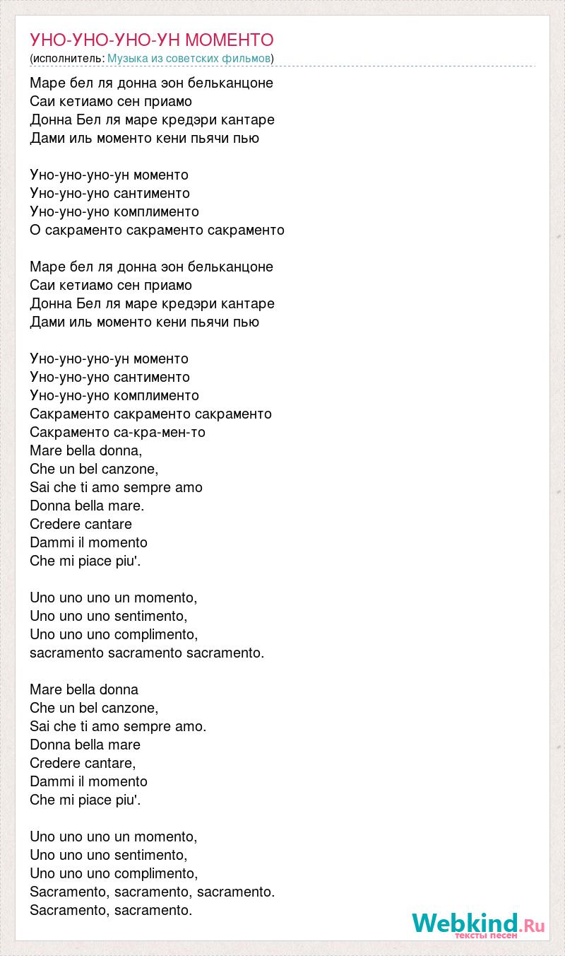 Маре бел ля донна эон бельканцоне Саи кетиамо сен приамо Донна Бел ля маре кредэри кантаре Дами иль моменто кени пьячи пью Уно-уно-уно-ун моменто Уно-уно-уно сантименто Уно-уно-уно комплименто О сакраменто сакраменто сакраменто Маре бел ля донна эон бельканцоне Саи кетиамо сен приамо Донна Бел ля маре кредэри кантаре Дами иль моменто кени пьячи пью Уно-уно-уно-ун моменто Уно-уно-уно сантименто Уно-уно-уно комплименто Сакраменто сакраменто сакраменто Сакраменто са-кра-мен-то Mare bella donna, Che un bel canzone, Sai che ti amo sempre amo Donna bella mare. Credere cantare Dammi il momento Che mi piace piu'. Uno uno uno un momento, Uno uno uno sentimento, Uno uno uno complimento, sacramento sacramento sacramento. Mare bella donna Che un bel canzone, Sai che ti amo sempre amo. Donna bella mare Credere cantare, Dammi il momento Che mi piace piu'. Uno uno uno un momento, Uno uno uno sentimento, Uno uno uno complimento, Sacramento, sacramento, sacramento. Sacramento, sacramento.
