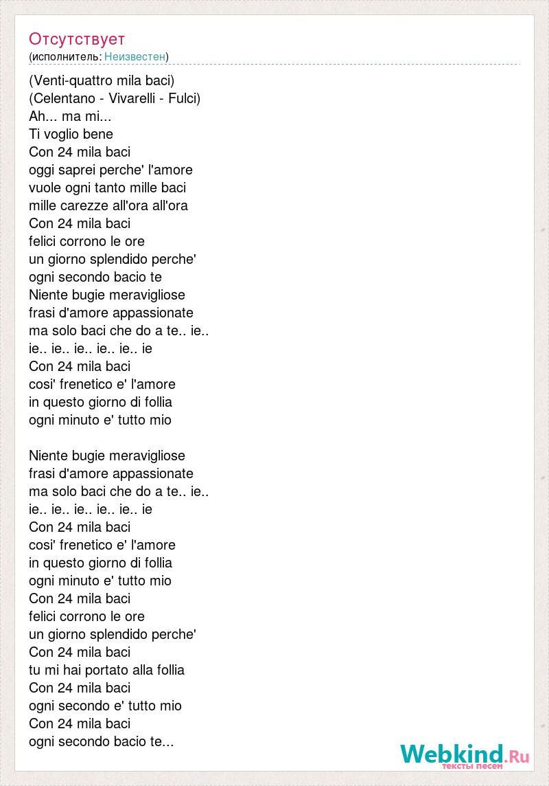(Venti-quattro mila baci) (Celentano - Vivarelli - Fulci) Ah... ma mi... Ti voglio bene Con 24 mila baci oggi saprei perche' l'amore vuole ogni tanto mille baci mille carezze all'ora all'ora Con 24 mila baci felici corrono le ore un giorno splendido perche' ogni secondo bacio te Niente bugie meravigliose frasi d'amore appassionate ma solo baci che do a te.. ie.. ie.. ie.. ie.. ie.. ie.. ie Con 24 mila baci cosi' frenetico e' l'amore in questo giorno di follia ogni minuto e' tutto mio Niente bugie meravigliose frasi d'amore appassionate ma solo baci che do a te.. ie.. ie.. ie.. ie.. ie.. ie.. ie Con 24 mila baci cosi' frenetico e' l'amore in questo giorno di follia ogni minuto e' tutto mio Con 24 mila baci felici corrono le ore un giorno splendido perche' Con 24 mila baci tu mi hai portato alla follia Con 24 mila baci ogni secondo e' tutto mio Con 24 mila baci ogni secondo bacio te...