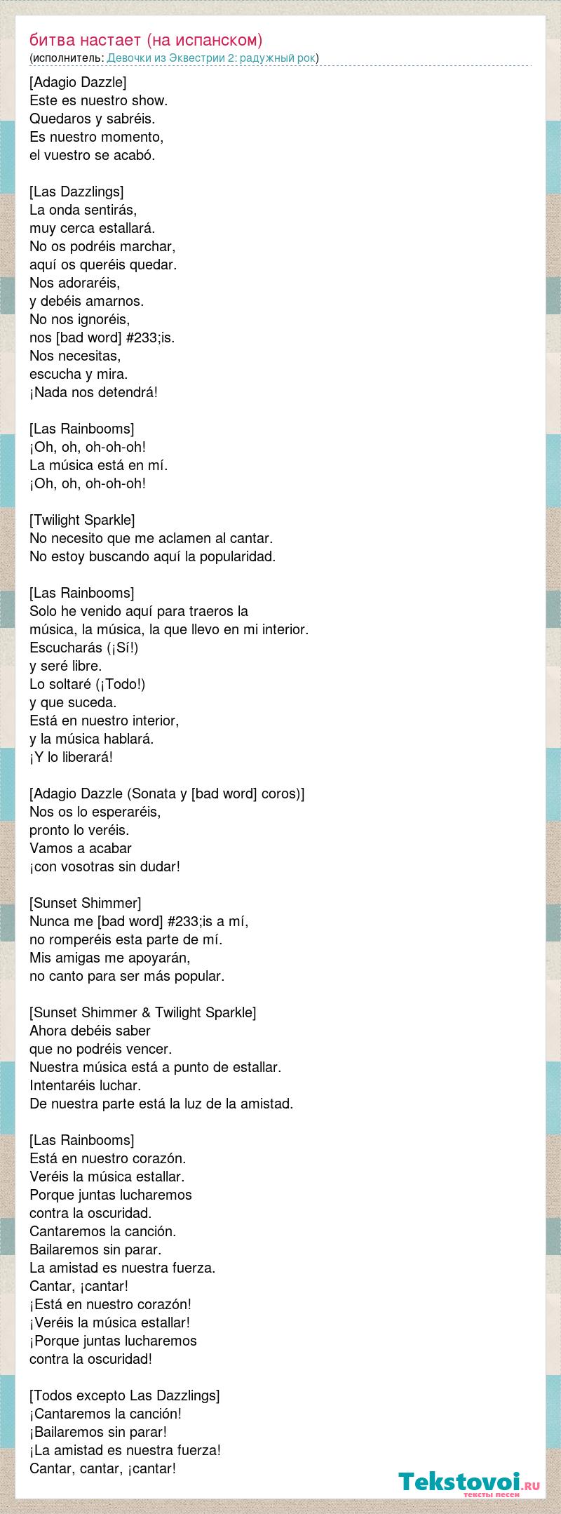 [Adagio Dazzle] Este es nuestro show. Quedaros y sabréis. Es nuestro momento, el vuestro se acabó. [Las Dazzlings] La onda sentirás, muy cerca estallará. No os podréis marchar, aquí os queréis quedar. Nos adoraréis, y debéis amarnos. No nos ignoréis, nos [bad word] #233;is. Nos necesitas, escucha y mira. ¡Nada nos detendrá! [Las Rainbooms] ¡Oh, oh, oh-oh-oh! La música está en mí. ¡Oh, oh, oh-oh-oh! [Twilight Sparkle] No necesito que me aclamen al cantar. No estoy buscando aquí la popularidad. [Las Rainbooms] Solo he venido aquí para traeros la música, la música, la que llevo en mi interior. Escucharás (¡Sí!) y seré libre. Lo soltaré (¡Todo!) y que suceda. Está en nuestro interior, y la música hablará. ¡Y lo liberará! [Adagio Dazzle (Sonata y [bad word] coros)] Nos os lo esperaréis, pronto lo veréis. Vamos a acabar ¡con vosotras sin dudar! [Sunset Shimmer] Nunca me [bad word] #233;is a mí, no romperéis esta parte de mí. Mis amigas me apoyarán, no canto para ser más popular. [Sunset Shimmer & Twilight Sparkle] Ahora debéis saber que no podréis vencer. Nuestra música está a punto de estallar. Intentaréis luchar. De nuestra parte está la luz de la amistad. [Las Rainbooms] Está en nuestro corazón. Veréis la música estallar. Porque juntas lucharemos contra la oscuridad. Cantaremos la canción. Bailaremos sin parar. La amistad es nuestra fuerza. Cantar, ¡cantar! ¡Está en nuestro corazón! ¡Veréis la música estallar! ¡Porque juntas lucharemos contra la oscuridad! [Todos excepto Las Dazzlings] ¡Cantaremos la canción! ¡Bailaremos sin parar! ¡La amistad es nuestra fuerza! Cantar, cantar, ¡cantar!