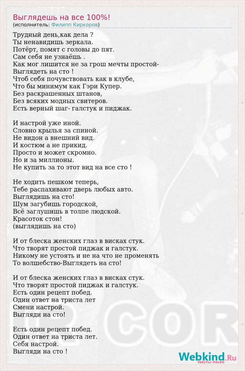 Трудный день,как дела ? Ты ненавидишь зеркала. Потёрт, помят с головы до пят. Сам себя не узнаёшь . Как мог лишится не за грош мечты простой- Выглядеть на сто ! Чтоб себя почувствовать как в клубе, Что бы минимум как Гэри Купер. Без раскрашенных штанов, Без всяких модных свитеров. Есть верный шаг- галстук и пиджак. И настрой уже иной. Словно крылья за спиной. Не видон а внешний вид. И костюм а не прикид. Просто и может скромно. Но и за миллионы. Не купить за то этот вид на все сто ! Не ходить пешком теперь, Тебе распахивают дверь любых авто. Выглядишь на сто! Шум загубишь городской, Всё заглушишь в толпе людской. Красоток стон! (выглядишь на сто) И от блеска женских глаз в висках стук. Что творят простой пиджак и галстук. Никому не устоять и не на что не променять То волшебство-Выглядеть на сто! И от блеска женских глаз в висках стук. Что творят простой пиджак и галстук. Есть один рецепт побед. Один ответ на триста лет Смени настрой. Выгляди на сто! Есть один рецепт побед. Один ответ на триста лет. Себя настрой. Выгляди на сто !