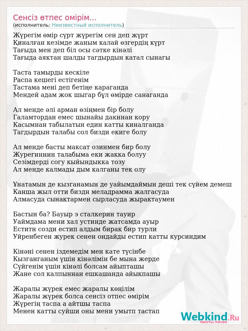 Жүрегім өмір сүрт жүрегім сен деп жүрт Қиналған кезімде жаным калай өзгердің күрт Тағыда мен деп біл осы сәтке кінәлі Тағыда аяктан шалды тагдырдын катал сынагы Таста тамырды кескіле Распа кешегі естігенім Тастама мені деп бетіңе караганда Мендей адам жок шыгар бұл өмірде санаганда Ал менде әлі арман өзіңмен бір болу Галамтордан емес шынайы дакннан кору Касымнан табылатын един катты киналганда Тагдырдын талабы сол бизди екиге болу Ал менде басты максат озинмен бир болу Журегиннин талабыма еки жакка болуу Сезімдерді согу кыйындыкка тозу Ал менде калмады дым калганы тек олу Ұнатамын де кызганамын де уайымдаймын деші тек сүйем демеш Канша жыл отти биздн меладрамма жалгасуда Алмасуда сынактармен сырласуда жырактаумен Бастын ба? Бауыр э сталкерин тауир Уаймдама мени хал устинде жатсамда ауыр Еститн созди естип алдым бирак бир турли Уйренбеген журек сенен ондайды естип катты курсиндим Кінәні сенен іздемедім мен кате түсінбе Кызганганым үшін кінәлімін бе мына жерде Сүйгенім үшін кінәлі болсам айыпташы Жане сол калпыннан ешкашанда айыкпашы Жаралы жүрек емес жаралы көңілім Жаралы жүрек болса сенсіз отпес өмірім Жүрегің таспа а айтшы таспа Менен катты суйши оны мени умытп тастап