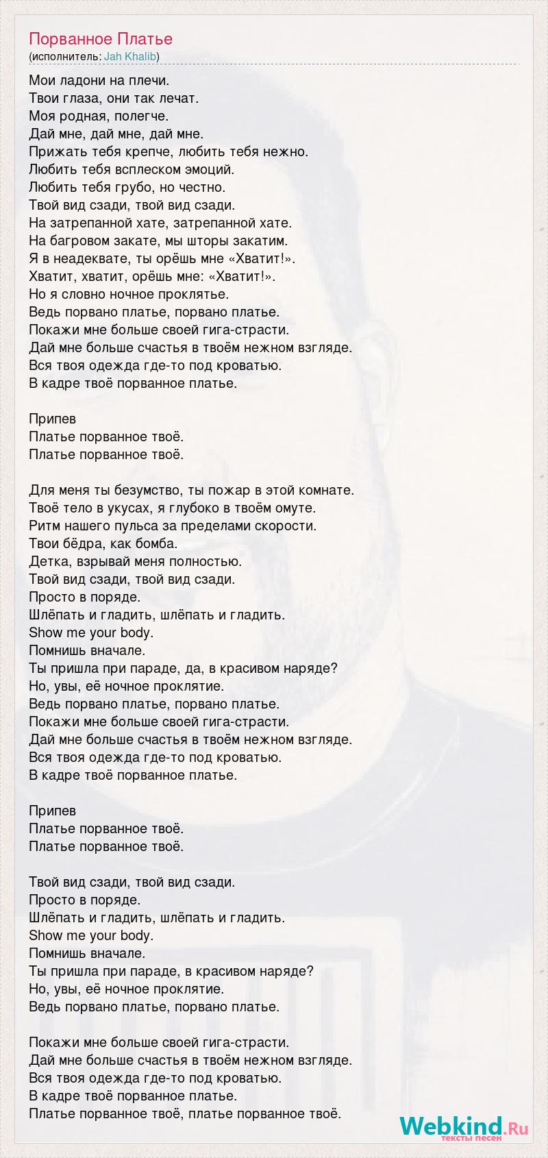 Мои ладони на плечи. Твои глаза, они так лечат. Моя родная, полегче. Дай мне, дай мне, дай мне. Прижать тебя крепче, любить тебя нежно. Любить тебя всплеском эмоций. Любить тебя грубо, но честно. Твой вид сзади, твой вид сзади. На затрепанной хате, затрепанной хате. На багровом закате, мы шторы закатим. Я в неадеквате, ты орёшь мне «Хватит!». Хватит, хватит, орёшь мне: «Хватит!». Но я словно ночное проклятье. Ведь порвано платье, порвано платье. Покажи мне больше своей гига-страсти. Дай мне больше счастья в твоём нежном взгляде. Вся твоя одежда где-то под кроватью. В кадре твоё порванное платье. Припев Платье порванное твоё. Платье порванное твоё. Для меня ты безумство, ты пожар в этой комнате. Твоё тело в укусах, я глубоко в твоём омуте. Ритм нашего пульса за пределами скорости. Твои бёдра, как бомба. Детка, взрывай меня полностью. Твой вид сзади, твой вид сзади. Просто в поряде. Шлёпать и гладить, шлёпать и гладить. Show me your body. Помнишь вначале. Ты пришла при параде, да, в красивом наряде? Но, увы, её ночное проклятие. Ведь порвано платье, порвано платье. Покажи мне больше своей гига-страсти. Дай мне больше счастья в твоём нежном взгляде. Вся твоя одежда где-то под кроватью. В кадре твоё порванное платье. Припев Платье порванное твоё. Платье порванное твоё. Твой вид сзади, твой вид сзади. Просто в поряде. Шлёпать и гладить, шлёпать и гладить. Show me your body. Помнишь вначале. Ты пришла при параде, в красивом наряде? Но, увы, её ночное проклятие. Ведь порвано платье, порвано платье. Покажи мне больше своей гига-страсти. Дай мне больше счастья в твоём нежном взгляде. Вся твоя одежда где-то под кроватью. В кадре твоё порванное платье. Платье порванное твоё, платье порванное твоё.