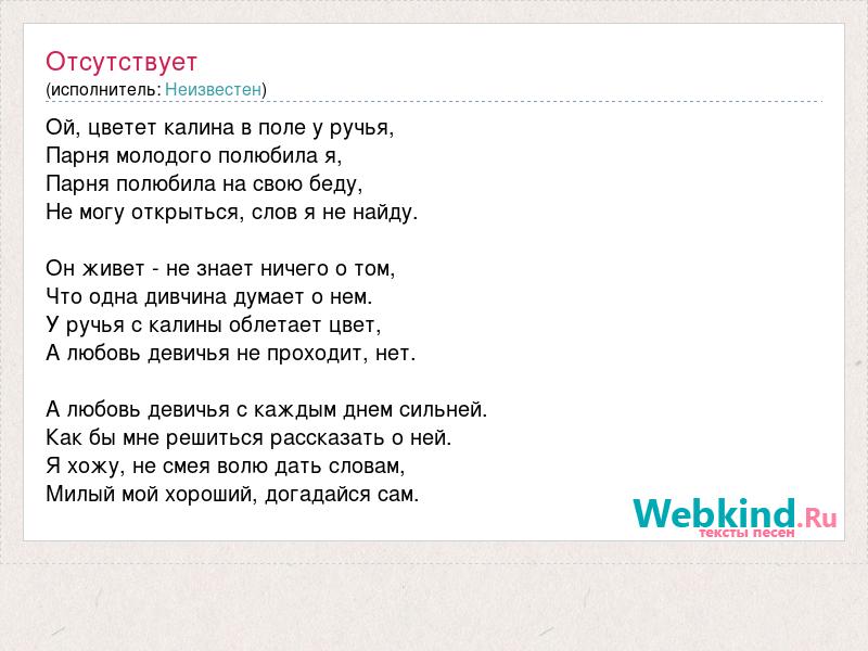Ой, цветет калина в поле у ручья, Парня молодого полюбила я, Парня полюбила на свою беду, Не могу открыться, слов я не найду. Он живет - не знает ничего о том, Что одна дивчина думает о нем. У ручья с калины облетает цвет, А любовь девичья не проходит, нет. А любовь девичья с каждым днем сильней. Как бы мне решиться рассказать о ней. Я хожу, не смея волю дать словам, Милый мой хороший, догадайся сам.