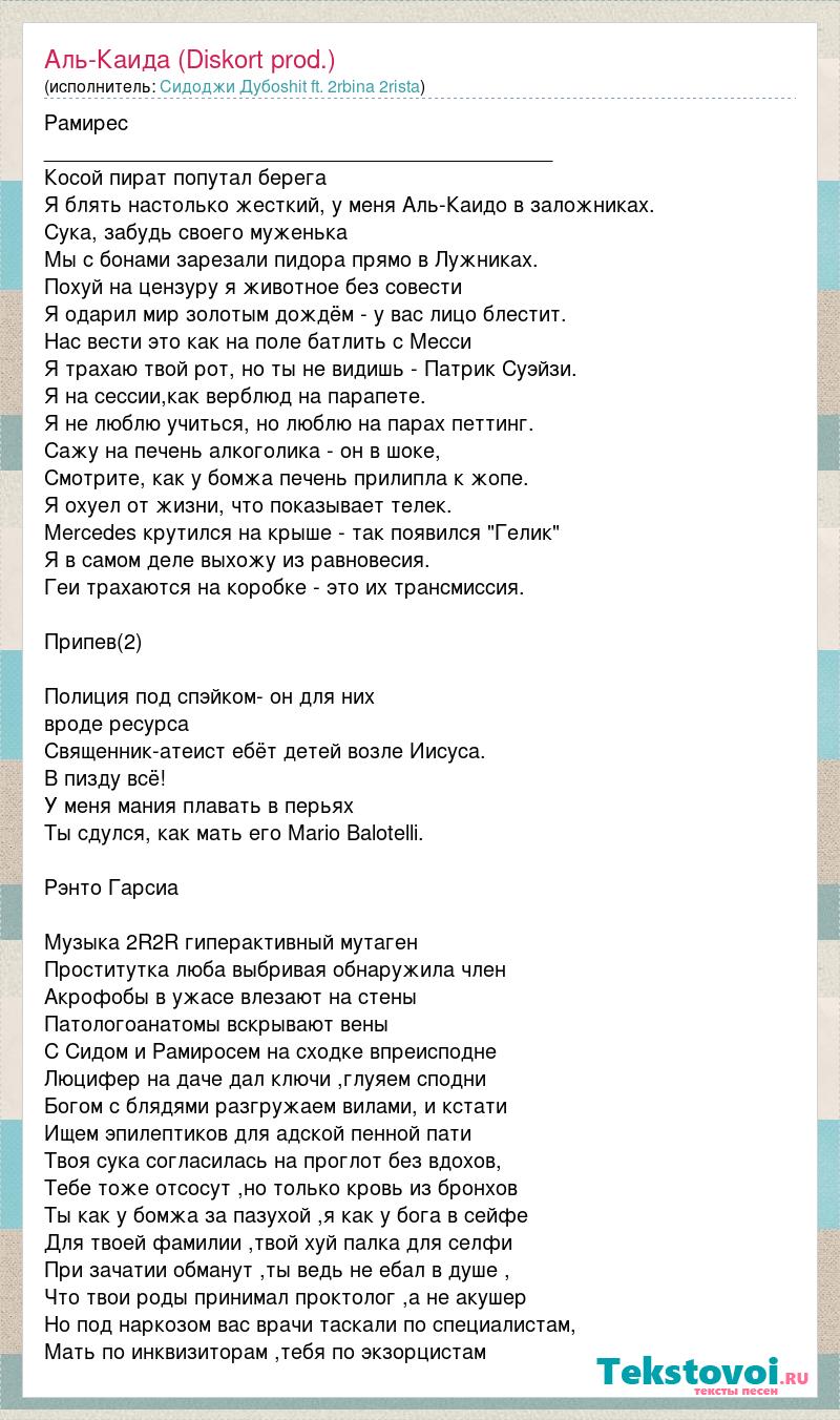 Рамирес ____________________________________________ Косой пират попутал берега Я блять настолько жесткий, у меня Аль-Каидо в заложниках. Сука, забудь своего муженька Мы с бонами зарезали пидора прямо в Лужниках. Похуй на цензуру я животное без совести Я одарил мир золотым дождём - у вас лицо блестит. Нас вести это как на поле батлить с Месси Я трахаю твой рот, но ты не видишь - Патрик Суэйзи. Я на сессии,как верблюд на парапете. Я не люблю учиться, но люблю на парах петтинг. Сажу на печень алкоголика - он в шоке, Смотрите, как у бомжа печень прилипла к жопе. Я охуел от жизни, что показывает телек. Mercedes крутился на крыше - так появился "Гелик" Я в самом деле выхожу из равновесия. Геи трахаются на коробке - это их трансмиссия. Припев(2) Полиция под спэйком- он для них вроде ресурса Священник-атеист ебёт детей возле Иисуса. В пизду всё! У меня мания плавать в перьях Ты сдулся, как мать его Mario Balotelli. Рэнто Гарсиа Музыка 2R2R гиперактивный мутаген Проститутка люба выбривая обнаружила член Акрофобы в ужасе влезают на стены Патологоанатомы вскрывают вены С Сидом и Рамиросем на сходке впреисподне Люцифер на даче дал ключи ,глуяем сподни Богом с блядями разгружаем вилами, и кстати Ищем эпилептиков для адской пенной пати Твоя сука согласилась на проглот без вдохов, Тебе тоже отсосут ,но только кровь из бронхов Ты как у бомжа за пазухой ,я как у бога в сейфе Для твоей фамилии ,твой хуй палка для селфи При зачатии обманут ,ты ведь не ебал в душе , Что твои роды принимал проктолог ,а не акушер Но под наркозом вас врачи таскали по специалистам, Мать по инквизиторам ,тебя по экзорцистам