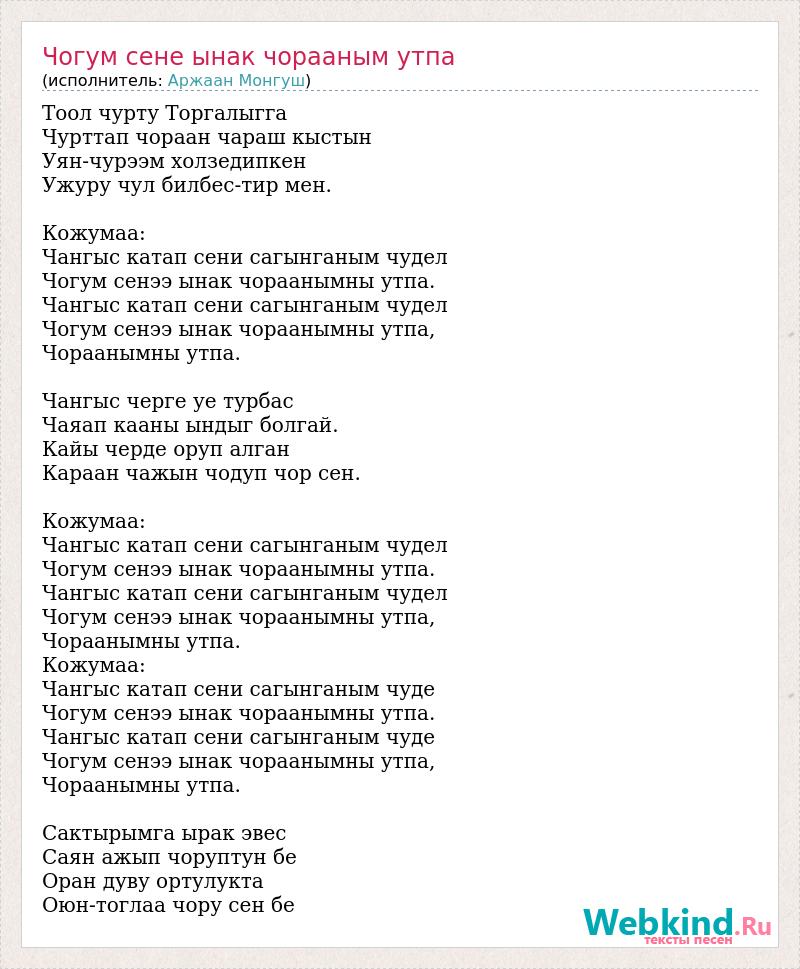 Тоол чурту Торгалыгга Чурттап чораан чараш кыстын Уян-чурээм холзедипкен Ужуру чул билбес-тир мен. Кожумаа: Чангыс катап сени сагынганым чудел Чогум сенээ ынак чораанымны утпа. Чангыс катап сени сагынганым чудел Чогум сенээ ынак чораанымны утпа, Чораанымны утпа. Чангыс черге уе турбас Чаяап кааны ындыг болгай. Кайы черде оруп алган Караан чажын чодуп чор сен. Кожумаа: Чангыс катап сени сагынганым чудел Чогум сенээ ынак чораанымны утпа. Чангыс катап сени сагынганым чудел Чогум сенээ ынак чораанымны утпа, Чораанымны утпа. Кожумаа: Чангыс катап сени сагынганым чуде Чогум сенээ ынак чораанымны утпа. Чангыс катап сени сагынганым чуде Чогум сенээ ынак чораанымны утпа, Чораанымны утпа. Сактырымга ырак эвес Саян ажып чоруптун бе Оран дуву ортулукта Оюн-тоглаа чору сен бе