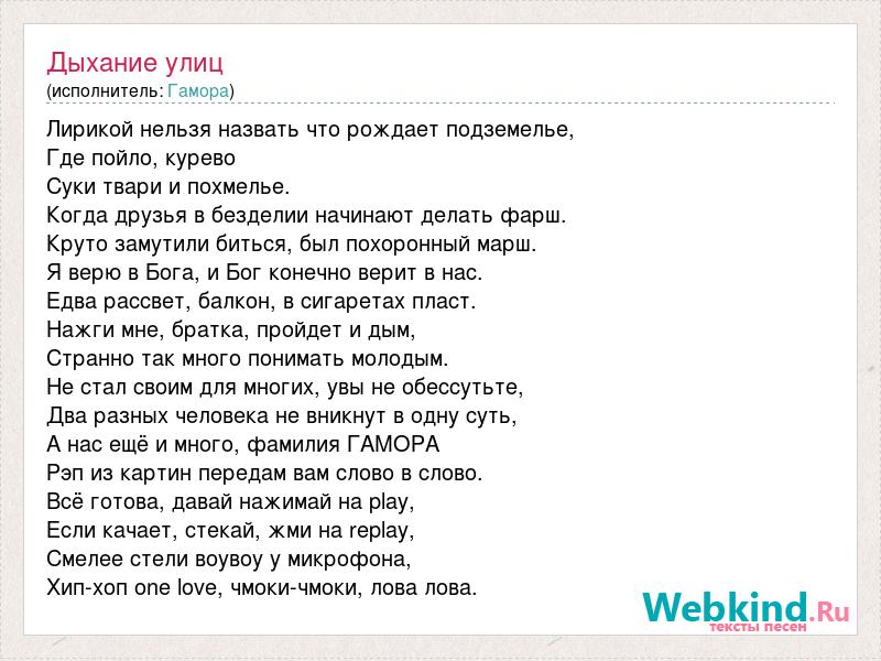 Лирикой нельзя назвать что рождает подземелье, Где пойло, курево Суки твари и похмелье. Когда друзья в безделии начинают делать фарш. Круто замутили биться, был похоронный марш. Я верю в Бога, и Бог конечно верит в нас. Едва рассвет, балкон, в сигаретах пласт. Нажги мне, братка, пройдет и дым, Странно так много понимать молодым. Не стал своим для многих, увы не обессутьте, Два разных человека не вникнут в одну суть, А нас ещё и много, фамилия ГАМОРА Рэп из картин передам вам слово в слово. Всё готова, давай нажимай на play, Если качает, стекай, жми на replay, Смелее стели воувоу у микрофона, Хип-хоп one love, чмоки-чмоки, лова лова.