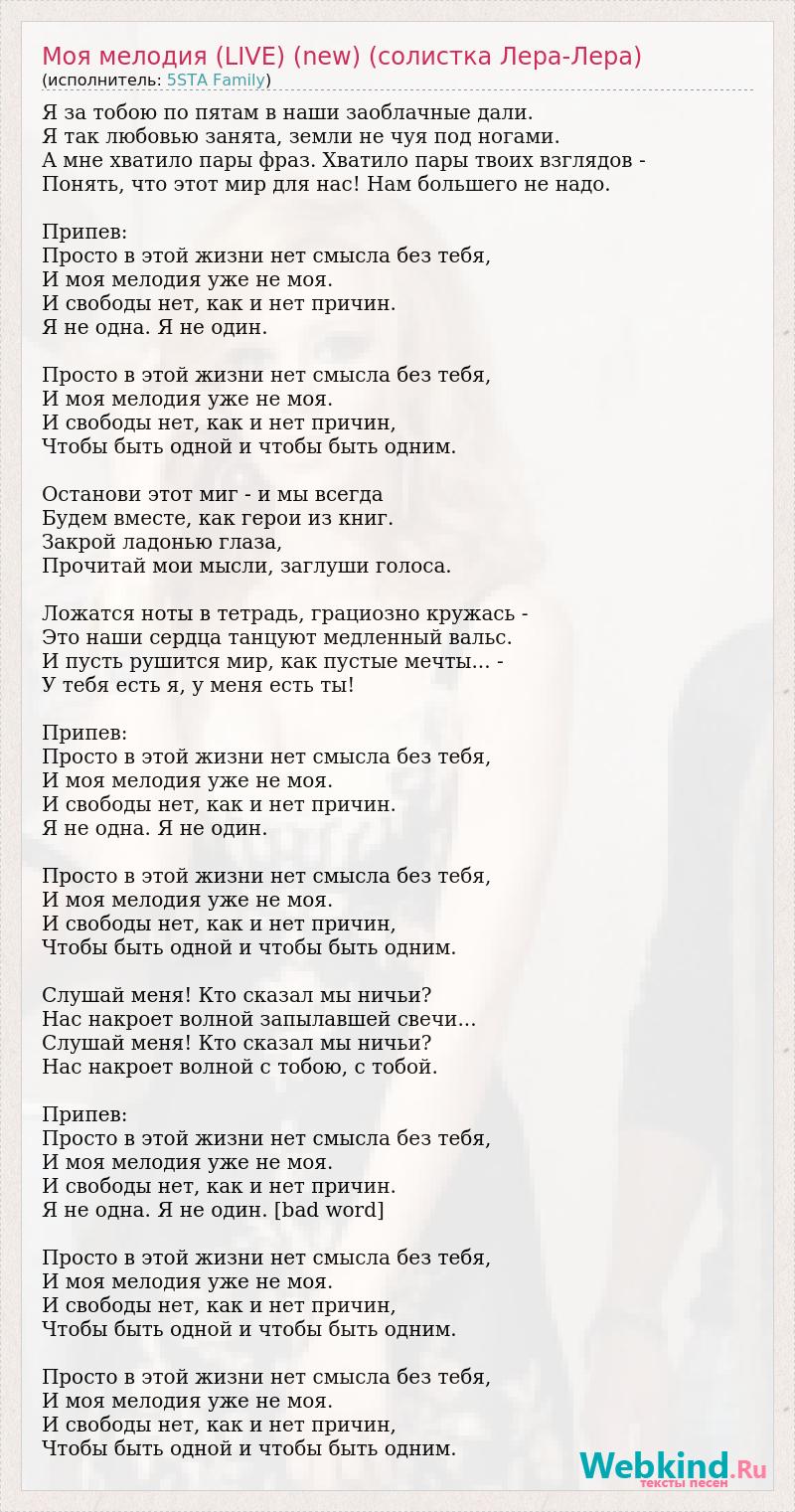 Я за тобою по пятам в наши заоблачные дали. Я так любовью занята, земли не чуя под ногами. А мне хватило пары фраз. Хватило пары твоих взглядов - Понять, что этот мир для нас! Нам большего не надо. Припев: Просто в этой жизни нет смысла без тебя, И моя мелодия уже не моя. И свободы нет, как и нет причин. Я не одна. Я не один. Просто в этой жизни нет смысла без тебя, И моя мелодия уже не моя. И свободы нет, как и нет причин, Чтобы быть одной и чтобы быть одним. Останови этот миг - и мы всегда Будем вместе, как герои из книг. Закрой ладонью глаза, Прочитай мои мысли, заглуши голоса. Ложатся ноты в тетрадь, грациозно кружась - Это наши сердца танцуют медленный вальс. И пусть рушится мир, как пустые мечты... - У тебя есть я, у меня есть ты! Припев: Просто в этой жизни нет смысла без тебя, И моя мелодия уже не моя. И свободы нет, как и нет причин. Я не одна. Я не один. Просто в этой жизни нет смысла без тебя, И моя мелодия уже не моя. И свободы нет, как и нет причин, Чтобы быть одной и чтобы быть одним. Слушай меня! Кто сказал мы ничьи? Нас накроет волной запылавшей свечи... Слушай меня! Кто сказал мы ничьи? Нас накроет волной с тобою, с тобой. Припев: Просто в этой жизни нет смысла без тебя, И моя мелодия уже не моя. И свободы нет, как и нет причин. Я не одна. Я не один. [bad word] Просто в этой жизни нет смысла без тебя, И моя мелодия уже не моя. И свободы нет, как и нет причин, Чтобы быть одной и чтобы быть одним. Просто в этой жизни нет смысла без тебя, И моя мелодия уже не моя. И свободы нет, как и нет причин, Чтобы быть одной и чтобы быть одним.