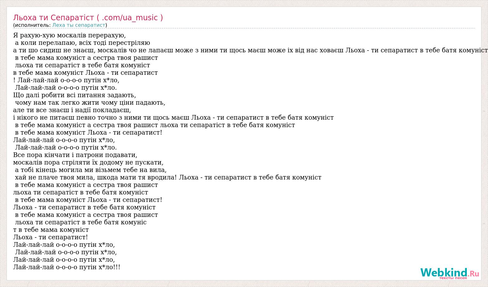 Я рахую-хую москалів перерахую, а коли перелапаю, всіх тоді перестріляю а ти шо сидиш не знаєш, москалів чо не лапаєш може з ними ти щось маєш може іх від нас ховаєш Льоха - ти сепаратист в тебе батя комуніст в тебе мама комуніст а сестра твоя рашист льоха ти сепаратіст в тебе батя комуніст в тебе мама комуніст Льоха - ти сепаратист ! Лай-лай-лай о-о-о-о путін х*ло, Лай-лай-лай о-о-о-о путін х*ло. Що далі робити всі питання задають, чому нам так легко жити чому ціни падають, але ти все знаєш і надії покладаєш, і нікого не питаєш певно точно з ними ти щось маєш Льоха - ти сепаратист в тебе батя комуніст в тебе мама комуніст а сестра твоя рашист льоха ти сепаратіст в тебе батя комуніст в тебе мама комуніст Льоха - ти сепаратист! Лай-лай-лай о-о-о-о путін х*ло, Лай-лай-лай о-о-о-о путін х*ло. Все пора кінчати і патрони подавати, москалів пора стріляти їх додому не пускати, а тобі кінець могила ми візьмем тебе на вила, хай не плаче твоя мила, шкода мати тя вродила! Льоха - ти сепаратист в тебе батя комуніст в тебе мама комуніст а сестра твоя рашист льоха ти сепаратіст в тебе батя комуніст в тебе мама комуніст Льоха - ти сепаратист! Льоха - ти сепаратист в тебе батя комуніст в тебе мама комуніст а сестра твоя рашист льоха ти сепаратіст в тебе батя комуніс т в тебе мама комуніст Льоха - ти сепаратист! Лай-лай-лай о-о-о-о путін х*ло, Лай-лай-лай о-о-о-о путін х*ло, Лай-лай-лай о-о-о-о путін х*ло, Лай-лай-лай о-о-о-о путін х*ло!!!