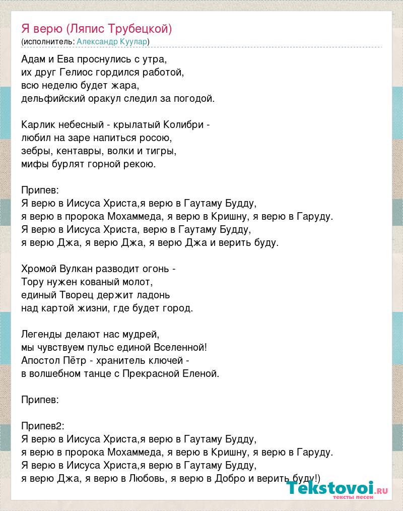 Адам и Ева проснулись с утра, их друг Гелиос гордился работой, всю неделю будет жара, дельфийский оракул следил за погодой. Карлик небесный - крылатый Колибри - любил на заре напиться росою, зебры, кентавры, волки и тигры, мифы бурлят горной рекою. Припев: Я верю в Иисуса Христа,я верю в Гаутаму Будду, я верю в пророка Мохаммеда, я верю в Кришну, я верю в Гаруду. Я верю в Иисуса Христа, верю в Гаутаму Будду, я верю Джа, я верю Джа, я верю Джа и верить буду. Хромой Вулкан разводит огонь - Тору нужен кованый молот, единый Творец держит ладонь над картой жизни, где будет город. Легенды делают нас мудрей, мы чувствуем пульс единой Вселенной! Апостол Пётр - хранитель ключей - в волшебном танце с Прекрасной Еленой. Припев: Припев2: Я верю в Иисуса Христа,я верю в Гаутаму Будду, я верю в пророка Мохаммеда, я верю в Кришну, я верю в Гаруду. Я верю в Иисуса Христа,я верю в Гаутаму Будду, я верю Джа, я верю в Любовь, я верю в Добро и верить буду!)