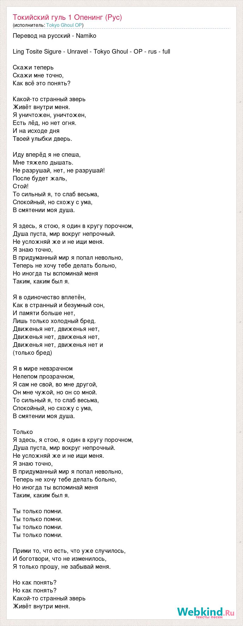 Перевод на русский - Namiko Ling Tosite Sigure - Unravel - Tokyo Ghoul - OP - rus - full Скажи теперь Скажи мне точно, Как всё это понять? Какой-то странный зверь Живёт внутри меня. Я уничтожен, уничтожен, Есть лёд, но нет огня. И на исходе дня Твоей улыбки дверь. Иду вперёд я не спеша, Мне тяжело дышать. Не разрушай, нет, не разрушай! После будет жаль, Стой! То сильный я, то слаб весьма, Спокойный, но схожу с ума, В смятении моя душа. Я здесь, я стою, я один в кругу порочном, Душа пуста, мир вокруг непрочный. Не усложняй же и не ищи меня. Я знаю точно, В придуманный мир я попал невольно, Теперь не хочу тебе делать больно, Но иногда ты вспоминай меня Таким, каким был я. Я в одиночество вплетён, Как в странный и безумный сон, И памяти больше нет, Лишь только холодный бред. Движенья нет, движенья нет, Движенья нет, движенья нет, Движенья нет, движенья нет и (только бред) Я в мире невзрачном Нелепом прозрачном, Я сам не свой, во мне другой, Он мне чужой, но он со мной. То сильный я, то слаб весьма, Спокойный, но схожу с ума, В смятении моя душа. Только Я здесь, я стою, я один в кругу порочном, Душа пуста, мир вокруг непрочный. Не усложняй же и не ищи меня. Я знаю точно, В придуманный мир я попал невольно, Теперь не хочу тебе делать больно, Но иногда ты вспоминай меня Таким, каким был я. Ты только помни. Ты только помни. Ты только помни. Ты только помни. Прими то, что есть, что уже случилось, И боготвори, что не изменилось, Я только прошу, не забывай меня. Но как понять? Но как понять? Какой-то странный зверь Живёт внутри меня.