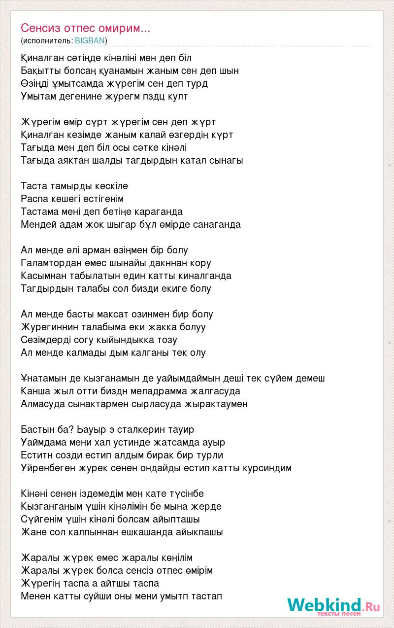 Қиналған сәтіңде кінәліні мен деп біл Бақытты болсаң қуанамын жаным сен деп шын Өзіңді ұмытсамда жүрегім сен деп турд Умытам дегенине журегм пздц култ Жүрегім өмір сүрт жүрегім сен деп жүрт Қиналған кезімде жаным калай өзгердің күрт Тағыда мен деп біл осы сәтке кінәлі Тағыда аяктан шалды тагдырдын катал сынагы Таста тамырды кескіле Распа кешегі естігенім Тастама мені деп бетіңе караганда Мендей адам жок шыгар бұл өмірде санаганда Ал менде әлі арман өзіңмен бір болу Галамтордан емес шынайы дакннан кору Касымнан табылатын един катты киналганда Тагдырдын талабы сол бизди екиге болу Ал менде басты максат озинмен бир болу Журегиннин талабыма еки жакка болуу Сезімдерді согу кыйындыкка тозу Ал менде калмады дым калганы тек олу Ұнатамын де кызганамын де уайымдаймын деші тек сүйем демеш Канша жыл отти биздн меладрамма жалгасуда Алмасуда сынактармен сырласуда жырактаумен Бастын ба? Ьауыр э сталкерин тауир Уаймдама мени хал устинде жатсамда ауыр Еститн созди естип алдым бирак бир турли Уйренбеген журек сенен ондайды естип катты курсиндим Кінәні сенен іздемедім мен кате түсінбе Кызганганым үшін кінәлімін бе мына жерде Сүйгенім үшін кінәлі болсам айыпташы Жане сол калпыннан ешкашанда айыкпашы Жаралы жүрек емес жаралы көңілім Жаралы жүрек болса сенсіз отпес өмірім Жүрегің таспа а айтшы таспа Менен катты суйши оны мени умытп тастап