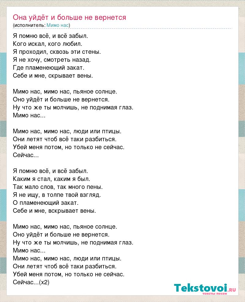 Я помню всё, и всё забыл. Кого искал, кого любил. Я проходил, сквозь эти стены. Я не хочу, смотреть назад. Где пламенеющий закат. Себе и мне, скрывает вены. Мимо нас, мимо нас, пьяное солнце. Оно уйдёт и больше не вернется. Ну что же ты молчишь, не поднимая глаз. Мимо нас... Мимо нас, мимо нас, люди или птицы. Они летят чтоб всё таки разбиться. Убей меня потом, но только не сейчас. Сейчас... Я помню всё, и всё забыл. Каким я стал, каким я был. Так мало слов, так много пены. Я не ищу, в толпе твой взгляд. О пламенеющий закат. Себе и мне, вскрывает вены. Мимо нас, мимо нас, пьяное солнце. Оно уйдёт и больше не вернется. Ну что же ты молчишь, не поднимая глаз. Мимо нас... Мимо нас, мимо нас, люди или птицы. Они летят чтоб всё таки разбиться. Убей меня потом, но только не сейчас. Сейчас...(х2)