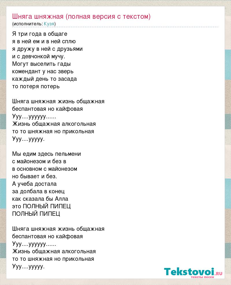 Я три года в общаге я в ней ем и в ней сплю я дружу в ней с друзьями и с девчонкой мучу. Могут выселить гады комендант у нас зверь каждый день то засада то потеря потерь Шняга шняжная жизнь общажная беспантовая но кайфовая Ууу....уууууу...... Жизнь общажная алкогольная то то шняжная но прикольная Ууу....ууууу. Мы едим здесь пельмени с майонезом и без в в основном с майонезом но бывает и без. А учеба достала за долбала в конец как сказала бы Алла это ПОЛНЫЙ ПИПЕЦ ПОЛНЫЙ ПИПЕЦ Шняга шняжная жизнь общажная беспантовая но кайфовая Ууу....уууууу...... Жизнь общажная алкогольная то то шняжная но прикольная Ууу....ууууу.