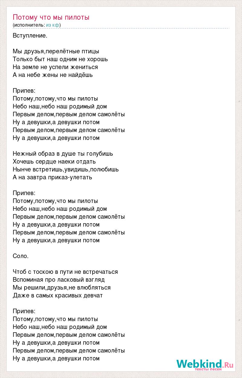 Вступление. Мы друзья,перелётные птицы Только быт наш одним не хорошь На земле не успели жениться А на небе жены не найдёшь Припев: Потому,потому,что мы пилоты Небо наш,небо наш родимый дом Первым делом,первым делом самолёты Ну а девушки,а девушки потом Первым делом,первым делом самолёты Ну а девушки,а девушки потом Нежный образ в душе ты голубишь Хочешь сердце наеки отдать Нынче встретишь,увидишь,полюбишь А на завтра приказ-улетать Припев: Потому,потому,что мы пилоты Небо наш,небо наш родимый дом Первым делом,первым делом самолёты Ну а девушки,а девушки потом Первым делом,первым делом самолёты Ну а девушки,а девушки потом Соло. Чтоб с тоскою в пути не встречаться Вспоминая про ласковый взгляд Мы решили,друзья,не влюбляться Даже в самых красивых девчат Припев: Потому,потому,что мы пилоты Небо наш,небо наш родимый дом Первым делом,первым делом самолёты Ну а девушки,а девушки потом Первым делом,первым делом самолёты Ну а девушки,а девушки потом