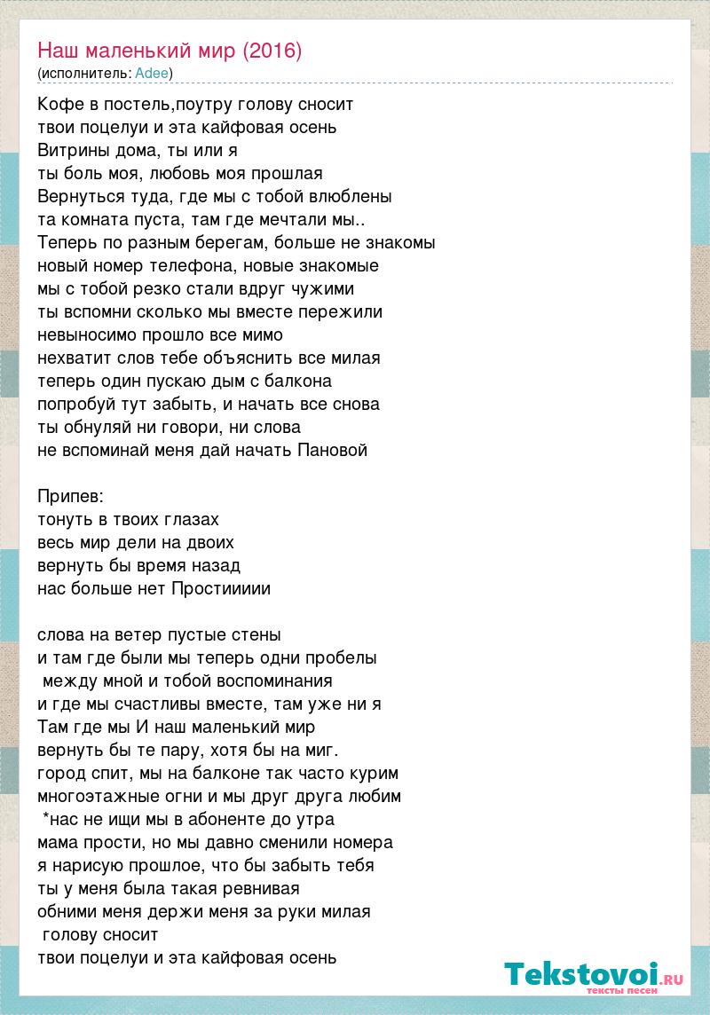 Кофе в постель,поутру голову сносит твои поцелуи и эта кайфовая осень Витрины дома, ты или я ты боль моя, любовь моя прошлая Вернуться туда, где мы с тобой влюблены та комната пуста, там где мечтали мы.. Теперь по разным берегам, больше не знакомы новый номер телефона, новые знакомые мы с тобой резко стали вдруг чужими ты вспомни сколько мы вместе пережили невыносимо прошло все мимо нехватит слов тебе объяснить все милая теперь один пускаю дым с балкона попробуй тут забыть, и начать все снова ты обнуляй ни говори, ни слова не вспоминай меня дай начать Пановой Припев: тонуть в твоих глазах весь мир дели на двоих вернуть бы время назад нас больше нет Простиииии слова на ветер пустые стены и там где были мы теперь одни пробелы между мной и тобой воспоминания и где мы счастливы вместе, там уже ни я Там где мы И наш маленький мир вернуть бы те пару, хотя бы на миг. город спит, мы на балконе так часто курим многоэтажные огни и мы друг друга любим *нас не ищи мы в абоненте до утра мама прости, но мы давно сменили номера я нарисую прошлое, что бы забыть тебя ты у меня была такая ревнивая обними меня держи меня за руки милая голову сносит твои поцелуи и эта кайфовая осень