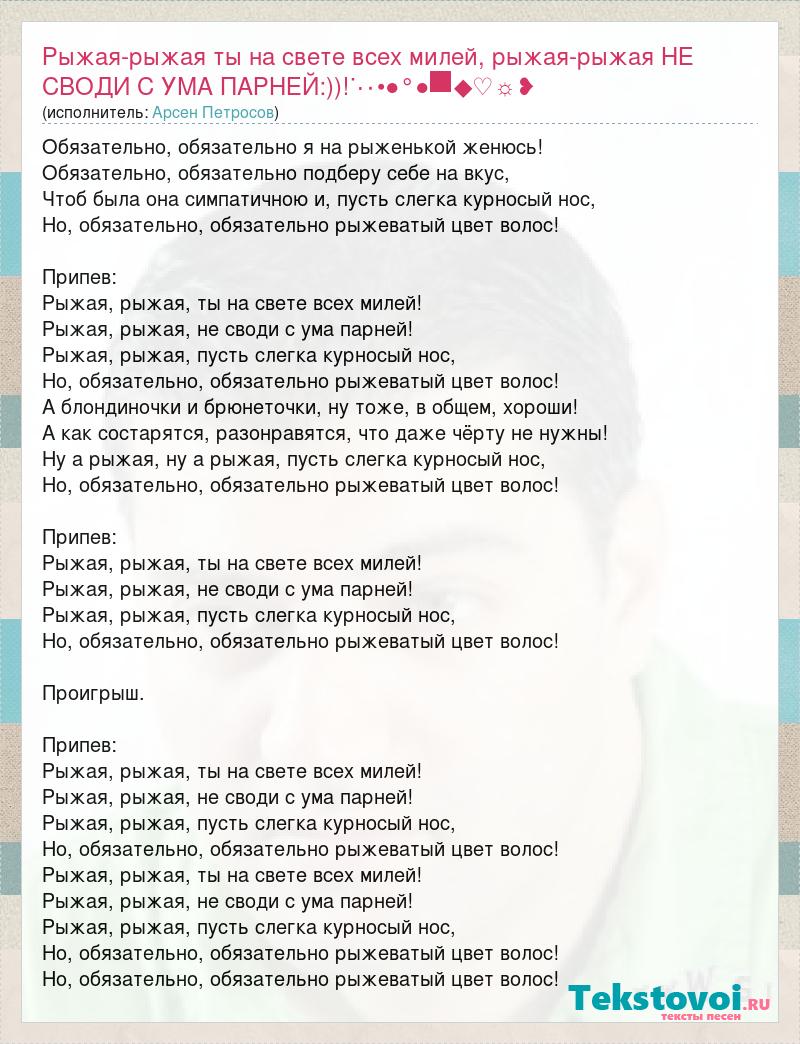 Обязательно, обязательно я на рыженькой женюсь! Обязательно, обязательно подберу себе на вкус, Чтоб была она симпатичною и, пусть слегка курносый нос, Но, обязательно, обязательно рыжеватый цвет волос! Припев: Рыжая, рыжая, ты на свете всех милей! Рыжая, рыжая, не своди с ума парней! Рыжая, рыжая, пусть слегка курносый нос, Но, обязательно, обязательно рыжеватый цвет волос! А блондиночки и брюнеточки, ну тоже, в общем, хороши! А как состарятся, разонравятся, что даже чёрту не нужны! Ну а рыжая, ну а рыжая, пусть слегка курносый нос, Но, обязательно, обязательно рыжеватый цвет волос! Припев: Рыжая, рыжая, ты на свете всех милей! Рыжая, рыжая, не своди с ума парней! Рыжая, рыжая, пусть слегка курносый нос, Но, обязательно, обязательно рыжеватый цвет волос! Проигрыш. Припев: Рыжая, рыжая, ты на свете всех милей! Рыжая, рыжая, не своди с ума парней! Рыжая, рыжая, пусть слегка курносый нос, Но, обязательно, обязательно рыжеватый цвет волос! Рыжая, рыжая, ты на свете всех милей! Рыжая, рыжая, не своди с ума парней! Рыжая, рыжая, пусть слегка курносый нос, Но, обязательно, обязательно рыжеватый цвет волос! Но, обязательно, обязательно рыжеватый цвет волос!