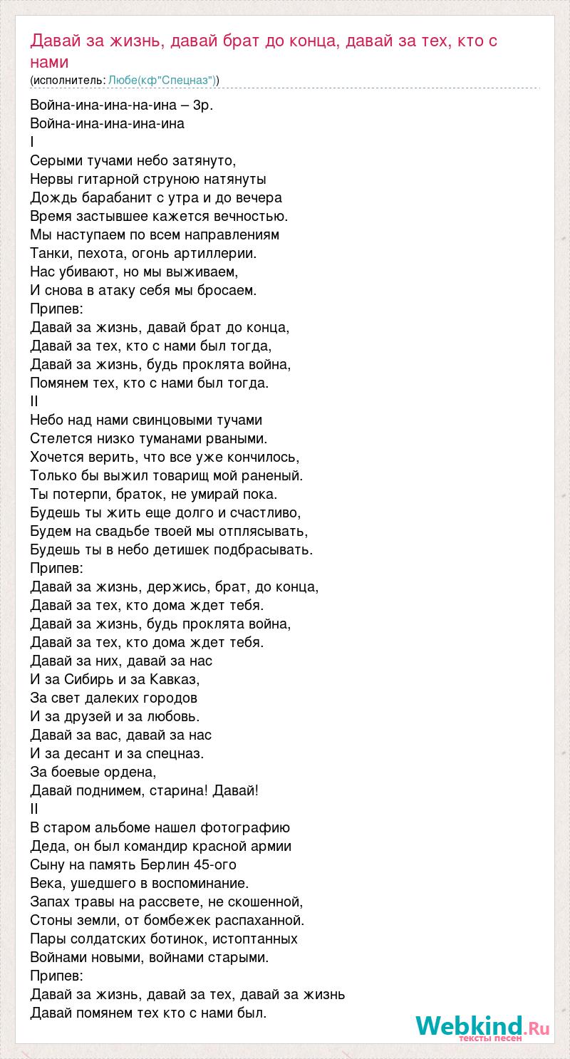 Война-ина-ина-на-ина – 3р. Война-ина-ина-ина-ина I Серыми тучами небо затянуто, Нервы гитарной струною натянуты Дождь барабанит с утра и до вечера Время застывшее кажется вечностью. Мы наступаем по всем направлениям Танки, пехота, огонь артиллерии. Нас убивают, но мы выживаем, И снова в атаку себя мы бросаем. Припев: Давай за жизнь, давай брат до конца, Давай за тех, кто с нами был тогда, Давай за жизнь, будь проклята война, Помянем тех, кто с нами был тогда. II Небо над нами свинцовыми тучами Стелется низко туманами рваными. Хочется верить, что все уже кончилось, Только бы выжил товарищ мой раненый. Ты потерпи, браток, не умирай пока. Будешь ты жить еще долго и счастливо, Будем на свадьбе твоей мы отплясывать, Будешь ты в небо детишек подбрасывать. Припев: Давай за жизнь, держись, брат, до конца, Давай за тех, кто дома ждет тебя. Давай за жизнь, будь проклята война, Давай за тех, кто дома ждет тебя. Давай за них, давай за нас И за Сибирь и за Кавказ, За свет далеких городов И за друзей и за любовь. Давай за вас, давай за нас И за десант и за спецназ. За боевые ордена, Давай поднимем, старина! Давай! II В старом альбоме нашел фотографию Деда, он был командир красной армии Сыну на память Берлин 45-ого Века, ушедшего в воспоминание. Запах травы на рассвете, не скошенной, Стоны земли, от бомбежек распаханной. Пары солдатских ботинок, истоптанных Войнами новыми, войнами старыми. Припев: Давай за жизнь, давай за тех, давай за жизнь Давай помянем тех кто с нами был.