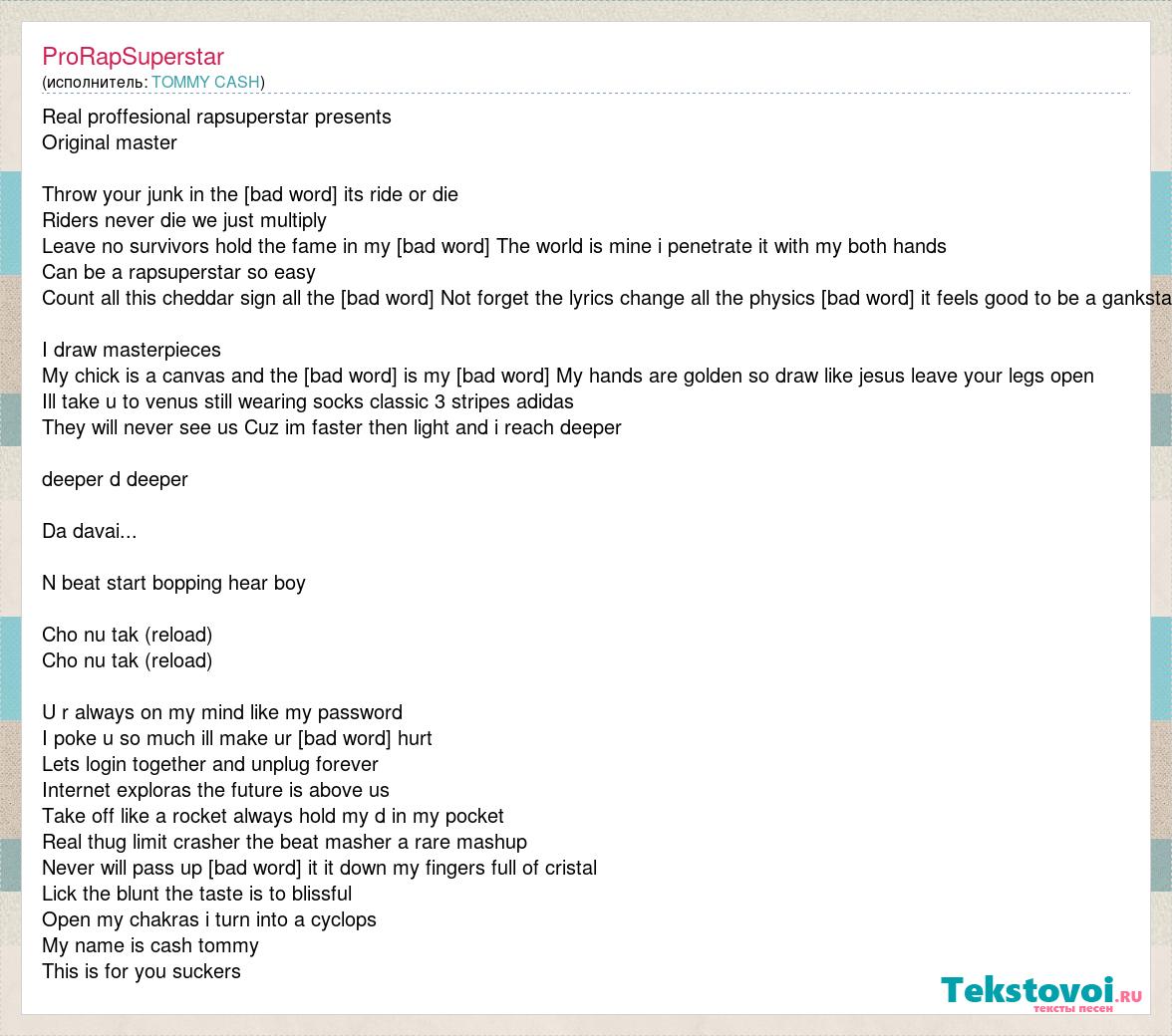 Real proffesional rapsuperstar presents Original master Throw your junk in the [bad word] its ride or die Riders never die we just multiply Leave no survivors hold the fame in my [bad word] The world is mine i penetrate it with my both hands Can be a rapsuperstar so easy Count all this cheddar sign all the [bad word] Not forget the lyrics change all the physics [bad word] it feels good to be a ganksta I draw masterpieces My chick is a canvas and the [bad word] is my [bad word] My hands are golden so draw like jesus leave your legs open Ill take u to venus still wearing socks classic 3 stripes adidas They will never see us Cuz im faster then light and i reach deeper deeper d deeper Da davai... N beat start bopping hear boy Cho nu tak (reload) Cho nu tak (reload) U r always on my mind like my password I poke u so much ill make ur [bad word] hurt Lets login together and unplug forever Internet exploras the future is above us Take off like a rocket always hold my d in my pocket Real thug limit crasher the beat masher a rare mashup Never will pass up [bad word] it it down my fingers full of cristal Lick the blunt the taste is to blissful Open my chakras i turn into a cyclops My name is cash tommy This is for you suckers