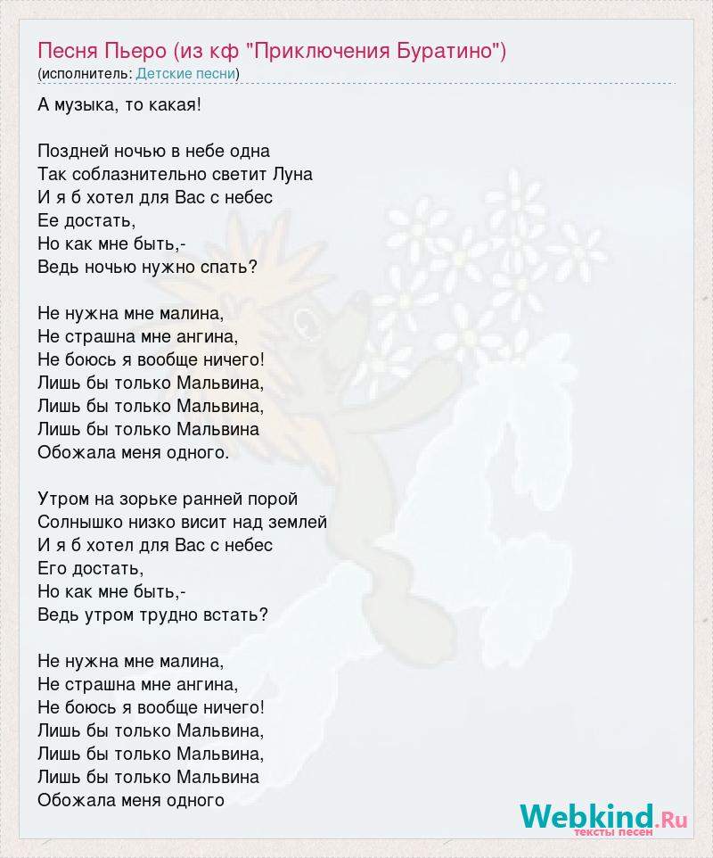 А музыка, то какая! Поздней ночью в небе одна Так соблазнительно светит Луна И я б хотел для Вас с небес Ее достать, Но как мне быть,- Ведь ночью нужно спать? Не нужна мне малина, Не страшна мне ангина, Не боюсь я вообще ничего! Лишь бы только Мальвина, Лишь бы только Мальвина, Лишь бы только Мальвина Обожала меня одного. Утром на зорьке ранней порой Солнышко низко висит над землей И я б хотел для Вас с небес Его достать, Но как мне быть,- Ведь утром трудно встать? Не нужна мне малина, Не страшна мне ангина, Не боюсь я вообще ничего! Лишь бы только Мальвина, Лишь бы только Мальвина, Лишь бы только Мальвина Обожала меня одного