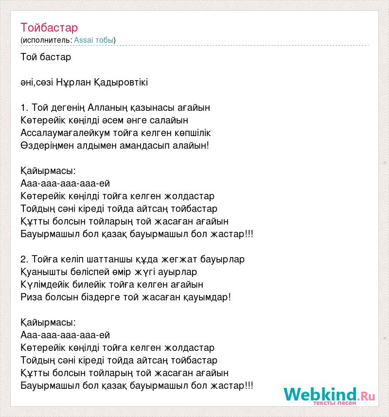 Той бастар әні,сөзі Нұрлан Қадыровтікі 1. Той дегенің Алланың қазынасы ағайын Көтерейік көңілді әсем әнге салайын Ассалаумағалейкум тойға келген көпшілік Өздеріңмен алдымен амандасып алайын! Қайырмасы: Ааа-ааа-ааа-ааа-ей Көтерейік көңілді тойға келген жолдастар Тойдың сәні кіреді тойда айтсаң тойбастар Құтты болсын тойларың той жасаған ағайын Бауырмашыл бол қазақ бауырмашыл бол жастар!!! 2. Тойға келіп шаттаншы құда жегжат бауырлар Қуанышты бөліспей өмір жүгі ауырлар Күлімдейік билейік тойға келген ағайын Риза болсын біздерге той жасаған қауымдар! Қайырмасы: Ааа-ааа-ааа-ааа-ей Көтерейік көңілді тойға келген жолдастар Тойдың сәні кіреді тойда айтсаң тойбастар Құтты болсын тойларың той жасаған ағайын Бауырмашыл бол қазақ бауырмашыл бол жастар!!!