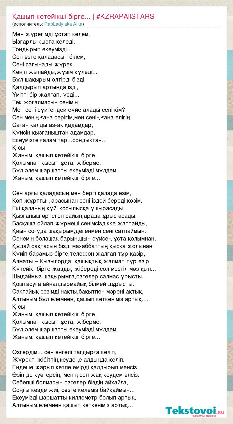 Мен жүрегімді ұстап келем, Ызғарлы қыста келеді. Тондырып екеумізді... Сен өзге қаладасын білем, Сені сағынады жүрек. Көңіл жылайды,жүзім күледі... Бұл шақырым өлтірді бізді, Қалдырып артында ізді, Үмітті бір жалғап, үзді... Тек жоғалмасын сенімін, Мен сені сүйгендей сүйе алады сені кім? Сен менің ғана серігім,мен сенің ғана елігің. Саған қалды аз-ақ қадамдар, Күйсін қызғаныштан адамдар. Екеумізге ғалам тар...сондықтан... Қ-сы Жаным, қашып кетейікші бірге, Қолымнан қысып ұста, жіберме. Бұл әлем шаршатты екеумізді мүлдем, Жаным, қашып кетейікші бірге... Сен арғы қаладасың,мен бергі қалада өзім, Көп жұрттың арасынан сені іздей береді көзім. Екі қаланың күйі қосылысқа ұшырасады, Қызғаныш өртеген сайын,арада ұрыс асады. Басқаша ойлап жүрмеші,сенімсіздікке жатпайды, Қиын соғуда шақырым,дегенмен сені сатпаймын. Сенемін болашақ барын,шын сүйсең ұста қолымнан, Құдай сақтасын бізді махаббаттың қысқа жолынан Күйіп барамыз бірге,телефон жалғап тұр қазір, Алматы – Қызылорда, қашықтық жалмап тұр әзір. Күтейік бірге жазды, жібереді сол мезгіл мәз қып... Шыдаймыз шақырымға,өзгелер салмас ұрысты, Қоштасуға айналдырмайық білмей дұрысты. Сақтайық сезімді нақты,бақытпен мәрені ақтық, Алтыным бұл әлемнен, қашып кеткеніміз артық.... Қ-сы Жаным, қашып кетейікші бірге, Қолымнан қысып ұста, жіберме. Бұл әлем шаршатты екеумізді мүлдем, Жаным, қашып кетейікші бірге... Өзгердім... сен енгелі тағдырға келіп, Жүректі жібіттің,кеудеңе алдыңда келіп. Еңдеше жарып кетпе,өмірді қалдырып мәнсіз, Өзің де куәгерсің, менің сол жақ кеудем әлсіз. Себепші болмасын өзгелер біздің айхайға, Соңғы кезде жиі, сөзге келеміз байқаймын... Екеумізді шаршатты киллометр болып артық, Алтыным,әлемнен қашып кеткеніміз артық...