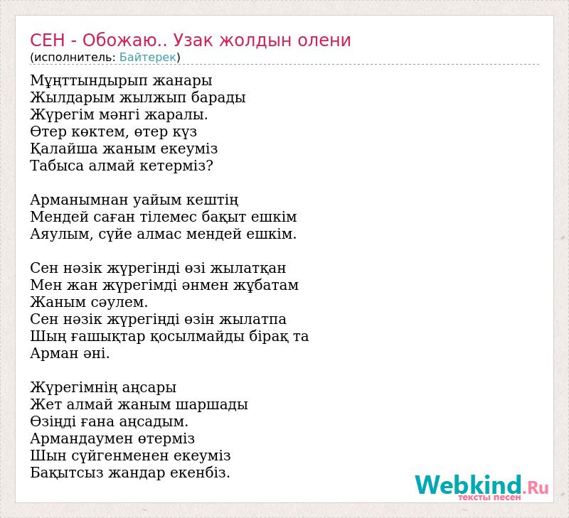 Мұңттындырып жанары Жылдарым жылжып барады Жүрегім мәнгі жаралы. Өтер көктем, өтер күз Қалайша жаным екеуміз Табыса алмай кетерміз? Арманымнан уайым кештің Мендей саған тілемес бақыт ешкім Аяулым, сүйе алмас мендей ешкім. Сен нәзік жүрегінді өзі жылатқан Мен жан жүрегімді әнмен жұбатам Жаным сәулем. Сен нәзік жүрегіңді өзін жылатпа Шың ғашықтар қосылмайды бірақ та Арман әні. Жүрегімнің аңсары Жет алмай жаным шаршады Өзіңді ғана аңсадым. Армандаумен өтерміз Шын сүйгенменен екеуміз Бақытсыз жандар екенбіз.