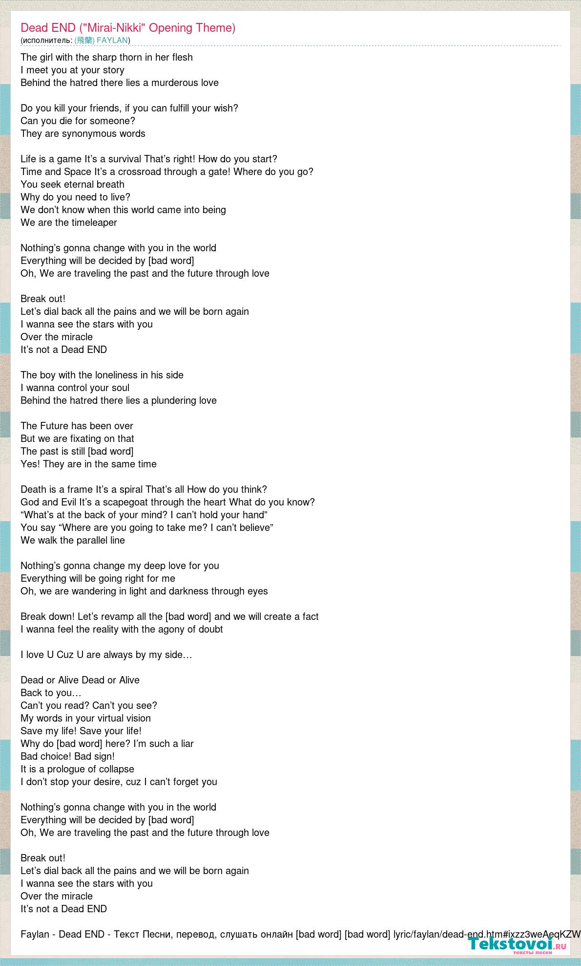 The girl with the sharp thorn in her flesh I meet you at your story Behind the hatred there lies a murderous love Do you kill your friends, if you can fulfill your wish? Can you die for someone? They are synonymous words Life is a game It’s a survival That’s right! How do you start? Time and Space It’s a crossroad through a gate! Where do you go? You seek eternal breath Why do you need to live? We don’t know when this world came into being We are the timeleaper Nothing’s gonna change with you in the world Everything will be decided by [bad word] Oh, We are traveling the past and the future through love Break out! Let’s dial back all the pains and we will be born again I wanna see the stars with you Over the miracle It’s not a Dead END The boy with the loneliness in his side I wanna control your soul Behind the hatred there lies a plundering love The Future has been over But we are fixating on that The past is still [bad word] Yes! They are in the same time Death is a frame It’s a spiral That’s all How do you think? God and Evil It’s a scapegoat through the heart What do you know? “What’s at the back of your mind? I can’t hold your hand” You say “Where are you going to take me? I can’t believe” We walk the parallel line Nothing’s gonna change my deep love for you Everything will be going right for me Oh, we are wandering in light and darkness through eyes Break down! Let’s revamp all the [bad word] and we will create a fact I wanna feel the reality with the agony of doubt I love U Cuz U are always by my side… Dead or Alive Dead or Alive Back to you… Can’t you read? Can’t you see? My words in your virtual vision Save my life! Save your life! Why do [bad word] here? I’m such a liar Bad choice! Bad sign! It is a prologue of collapse I don’t stop your desire, cuz I can’t forget you Nothing’s gonna change with you in the world Everything will be decided by [bad word] Oh, We are traveling the past and the future through love Break out! Let’s dial back all the pains and we will be born again I wanna see the stars with you Over the miracle It’s not a Dead END Faylan - Dead END - Текст Песни, перевод, слушать онлайн [bad word] [bad word] lyric/faylan/dead-end.htm#ixzz3weAeqKZW