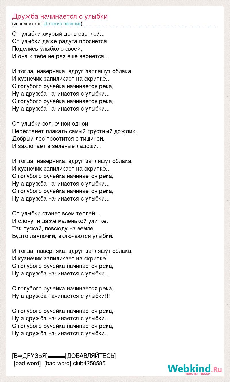 От улыбки хмурый день светлей... От улыбки даже радуга проснется! Поделись улыбкою своей, И она к тебе не раз еще вернется... И тогда, наверняка, вдруг запляшут облака, И кузнечик запиликает на скрипке... С голубого ручейка начинается река, Ну а дружба начинается с улыбки... С голубого ручейка начинается река, Ну а дружба начинается с улыбки... От улыбки солнечной одной Перестанет плакать самый грустный дождик, Добрый лес простится с тишиной, И захлопает в зеленые ладоши... И тогда, наверняка, вдруг запляшут облака, И кузнечик запиликает на скрипке... С голубого ручейка начинается река, Ну а дружба начинается с улыбки... С голубого ручейка начинается река, Ну а дружба начинается с улыбки... От улыбки станет всем теплей... И слону, и даже маленькой улитке. Так пускай, повсюду на земле, Будто лампочки, включаются улыбки. И тогда, наверняка, вдруг запляшут облака, И кузнечик запиликает на скрипке... С голубого ручейка начинается река, Ну а дружба начинается с улыбки... С голубого ручейка начинается река, Ну а дружба начинается с улыбки!!! С голубого ручейка начинается река, Ну а дружба начинается с улыбки... С голубого ручейка начинается река, Ну а дружба начинается с улыбки... _______________________________ [В⇨ДРУЗЬЯ]▬▬▬[ДОБАВЛЯЙТЕСЬ] [bad word] [bad word] club4258585