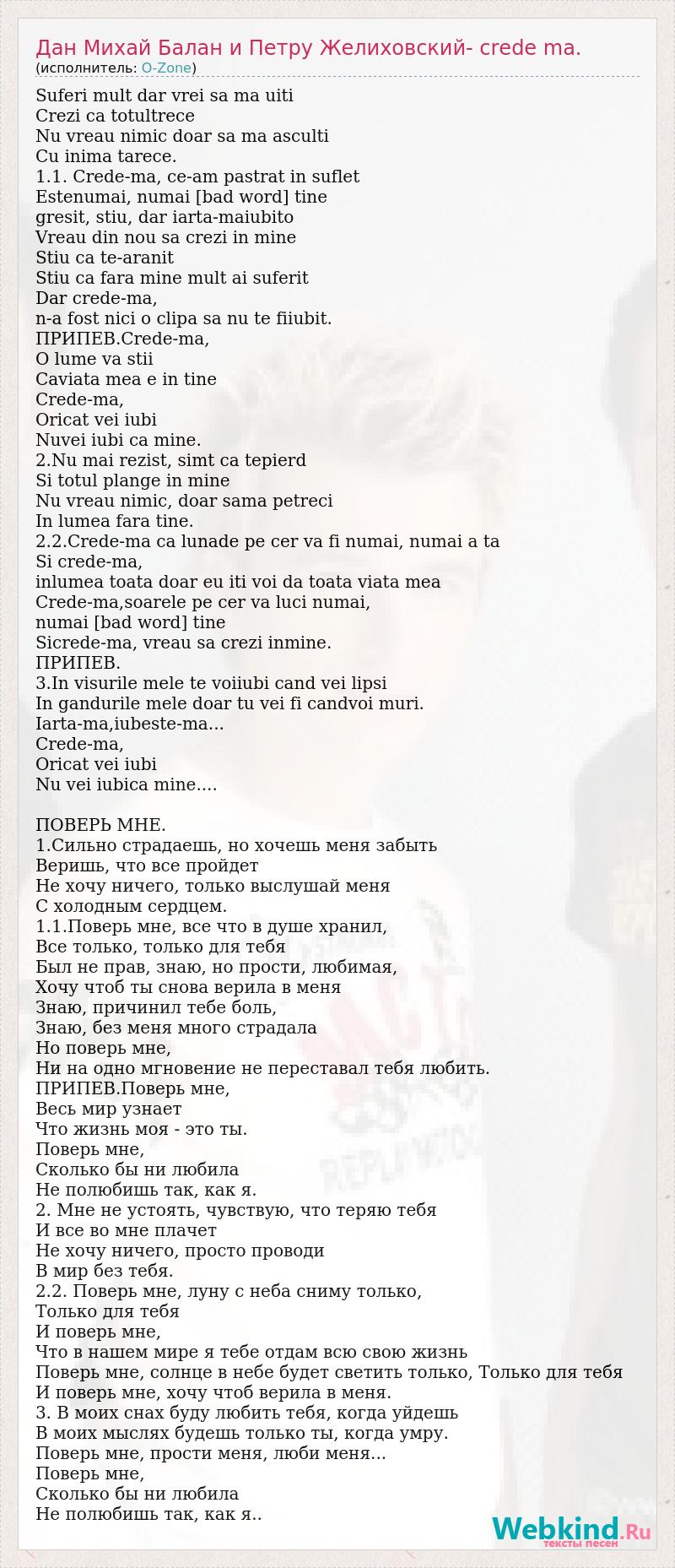 Suferi mult dar vrei sa ma uiti Crezi ca totultrece Nu vreau nimic doar sa ma asculti Cu inima tarece. 1.1. Crede-ma, ce-am pastrat in suflet Estenumai, numai [bad word] tine gresit, stiu, dar iarta-maiubito Vreau din nou sa crezi in mine Stiu ca te-aranit Stiu ca fara mine mult ai suferit Dar crede-ma, n-a fost nici o clipa sa nu te fiiubit. ПРИПЕВ.Crede-ma, O lume va stii Caviata mea e in tine Crede-ma, Oricat vei iubi Nuvei iubi ca mine. 2.Nu mai rezist, simt ca tepierd Si totul plange in mine Nu vreau nimic, doar sama petreci In lumea fara tine. 2.2.Crede-ma ca lunade pe cer va fi numai, numai a ta Si crede-ma, inlumea toata doar eu iti voi da toata viata mea Crede-ma,soarele pe cer va luci numai, numai [bad word] tine Sicrede-ma, vreau sa crezi inmine. ПРИПЕВ. 3.In visurile mele te voiiubi cand vei lipsi In gandurile mele doar tu vei fi candvoi muri. Iarta-ma,iubeste-ma... Crede-ma, Oricat vei iubi Nu vei iubica mine.... ПОВЕРЬ МНЕ. 1.Сильно страдаешь, но хочешь меня забыть Веришь, что все пройдет Не хочу ничего, только выслушай меня С холодным сердцем. 1.1.Поверь мне, все что в душе хранил, Все только, только для тебя Был не прав, знаю, но прости, любимая, Хочу чтоб ты снова верила в меня Знаю, причинил тебе боль, Знаю, без меня много страдала Но поверь мне, Ни на одно мгновение не переставал тебя любить. ПРИПЕВ.Поверь мне, Весь мир узнает Что жизнь моя - это ты. Поверь мне, Сколько бы ни любила Не полюбишь так, как я. 2. Мне не устоять, чувствую, что теряю тебя И все во мне плачет Не хочу ничего, просто проводи В мир без тебя. 2.2. Поверь мне, луну с неба сниму только, Только для тебя И поверь мне, Что в нашем мире я тебе отдам всю свою жизнь Поверь мне, солнце в небе будет светить только, Только для тебя И поверь мне, хочу чтоб верила в меня. 3. В моих снах буду любить тебя, когда уйдешь В моих мыслях будешь только ты, когда умру. Поверь мне, прости меня, люби меня... Поверь мне, Сколько бы ни любила Не полюбишь так, как я..