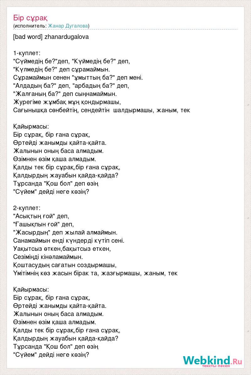 [bad word] zhanardugalova 1-куплет: "Сүймедің бе?"деп, "Күймедің бе?" деп, "Күлмедің бе?" деп сұрамаймын. Сұрамаймын сенен "ұмыттың ба?" деп мені. "Алдадың ба?" деп, "арбадың ба?" деп, "Жалғаның ба?" деп сыңнамаймын. Журегіме жұмбақ мұң қондырмашы, Сағынышқа сөнбейтің, сендейтін шалдырмашы, жаным, тек Қайырмасы: Бір сұрақ, бір ғана сұрақ, Өртейді жанымды қайта-қайта. Жалынын оның баса алмадым. Өзімнен өзім қаша алмадым. Қалды тек бір сұрақ,бір ғана сұрақ, Қалдырдың жауабын қайда-қайда? Тұрсанда "Қош бол" деп өзің "Сүйем" дейді неге көзің? 2-куплет: "Асықтың ғой" деп, "Ғашықпын ғой" деп, "Жасырдың" деп жылай алмаймын. Санамаймын енді күндерді күтіп сені. Уақытсыз өткен,бақытсыз еткен, Сезіміңді кінәламаймын. Қоштасудың сағатын создырмашы, Үмітімнің көз жасын бірак та, жазғырмашы, жаным, тек Қайырмасы: Бір сұрақ, бір ғана сұрақ, Өртейді жанымды қайта-қайта. Жалынын оның баса алмадым. Өзімнен өзім қаша алмадым. Қалды тек бір сұрақ,бір ғана сұрақ, Қалдырдың жауабын қайда-қайда? Тұрсанда "Қош бол" деп өзің "Сүйем" дейді неге көзің?