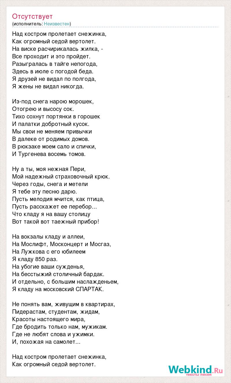 Над костром пролетает снежинка, Как огромный седой вертолет. На виске расчирикалась жилка, - Все проходит и это пройдет. Разыгралась в тайге непогода, Здесь в июле с погодой беда. Я друзей не видал по полгода, Я жены не видал никогда. Из-под снега нарою морошек, Отогрею и высосу сок. Тихо сохнут портянки в горошек И палатки добротный кусок. Мы свои не меняем привычки В далеке от родимых домов. В рюкзаке моем сало и спички, И Тургенева восемь томов. Ну а ты, моя нежная Пери, Мой надежный страховочный крюк. Через годы, снега и метели Я тебе эту песню дарю. Пусть мелодия мчится, как птица, Пусть расскажет ее перебор... Что кладу я на вашу столицу Вот такой вот таежный прибор! На вокзалы кладу и аллеи, На Мослифт, Москонцерт и Мосгаз, На Лужкова с его юбилеем Я кладу 850 раз. На убогие ваши сужденья, На бесстыжий столичный бардак. И отдельно, с большим наслажденьем, Я кладу на московский СПАРТАК. Не понять вам, живущим в квартирах, Пидерастам, студентам, жидам, Красоты настоящего мира, Где бродить только нам, мужикам. Где не любят слова и ужимки. И, похожая на самолет... Над костром пролетает снежинка, Как огромный седой вертолет.