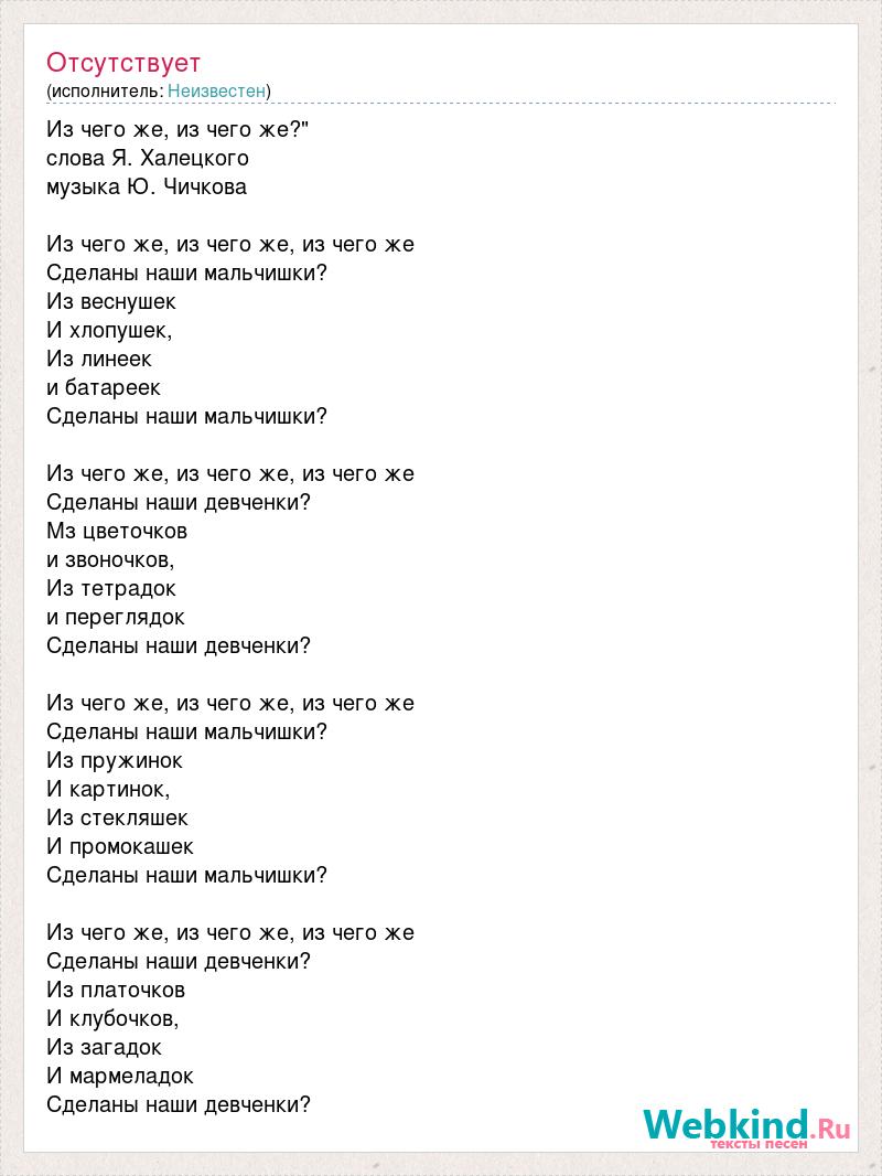 Из чего же, из чего же?" слова Я. Халецкого музыка Ю. Чичкова Из чего же, из чего же, из чего же Сделаны наши мальчишки? Из веснушек И хлопушек, Из линеек и батареек Сделаны наши мальчишки? Из чего же, из чего же, из чего же Сделаны наши девченки? Мз цветочков и звоночков, Из тетрадок и переглядок Сделаны наши девченки? Из чего же, из чего же, из чего же Сделаны наши мальчишки? Из пружинок И картинок, Из стекляшек И промокашек Сделаны наши мальчишки? Из чего же, из чего же, из чего же Сделаны наши девченки? Из платочков И клубочков, Из загадок И мармеладок Сделаны наши девченки?