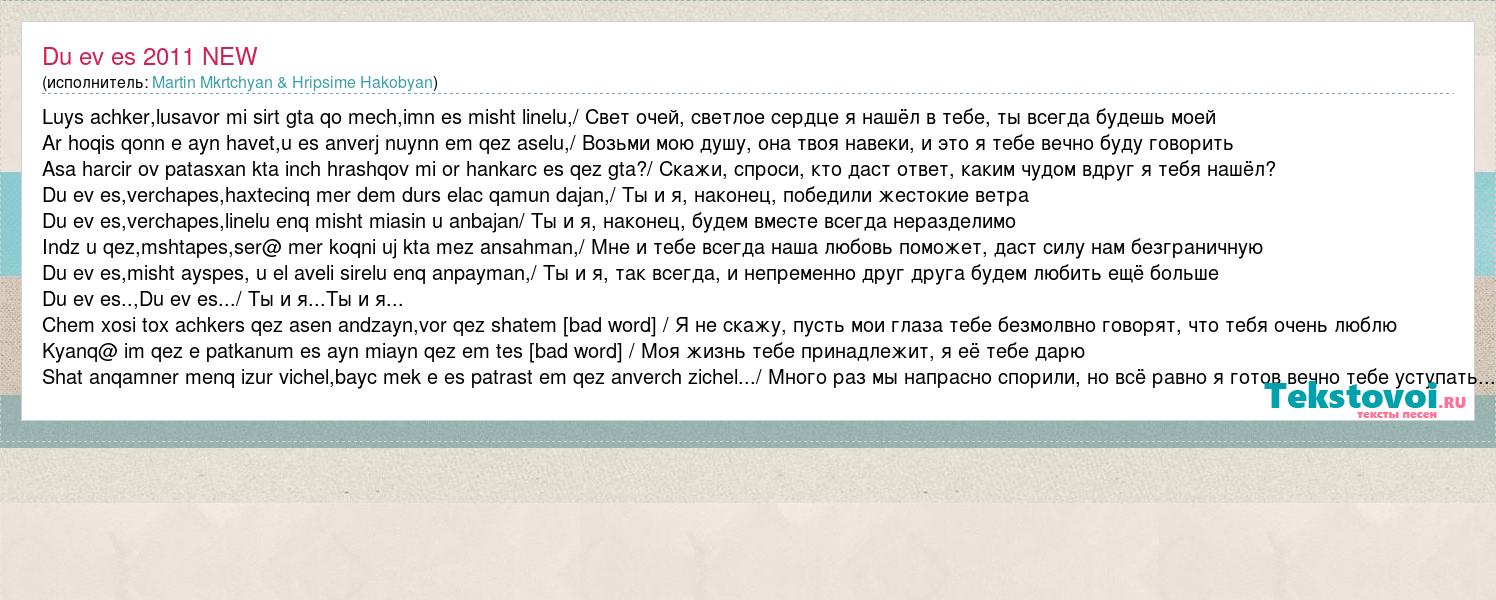 Luys achker,lusavor mi sirt gta qo mech,imn es misht linelu,/ Свет очей, светлое сердце я нашёл в тебе, ты всегда будешь моей Ar hoqis qonn e ayn havet,u es anverj nuynn em qez aselu,/ Возьми мою душу, она твоя навеки, и это я тебе вечно буду говорить Asa harcir ov patasxan kta inch hrashqov mi or hankarc es qez gta?/ Скажи, спроси, кто даст ответ, каким чудом вдруг я тебя нашёл? Du ev es,verchapes,haxtecinq mer dem durs elac qamun dajan,/ Ты и я, наконец, победили жестокие ветра Du ev es,verchapes,linelu enq misht miasin u anbajan/ Ты и я, наконец, будем вместе всегда неразделимо Indz u qez,mshtapes,ser@ mer koqni uj kta mez ansahman,/ Мне и тебе всегда наша любовь поможет, даст силу нам безграничную Du ev es,misht ayspes, u el aveli sirelu enq anpayman,/ Ты и я, так всегда, и непременно друг друга будем любить ещё больше Du ev es..,Du ev es.../ Ты и я...Ты и я... Chem xosi tox achkers qez asen andzayn,vor qez shatem [bad word] / Я не скажу, пусть мои глаза тебе безмолвно говорят, что тебя очень люблю Kyanq@ im qez e patkanum es ayn miayn qez em tes [bad word] / Моя жизнь тебе принадлежит, я её тебе дарю Shat anqamner menq izur vichel,bayc mek e es patrast em qez anverch zichel.../ Много раз мы напрасно спорили, но всё равно я готов вечно тебе уступать...