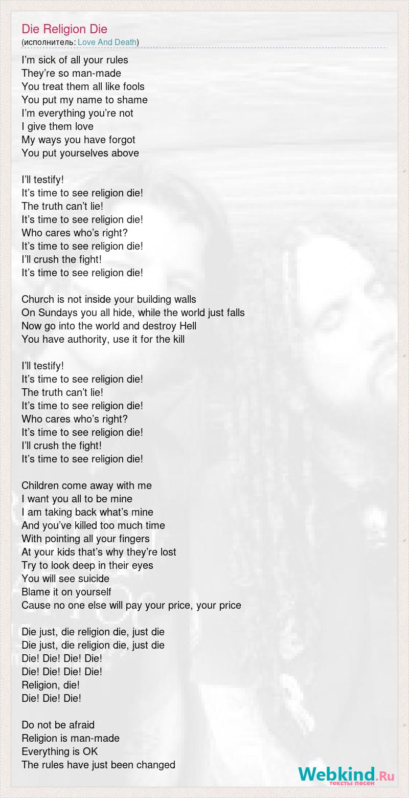 I’m sick of all your rules They’re so man-made You treat them all like fools You put my name to shame I’m everything you’re not I give them love My ways you have forgot You put yourselves above I’ll testify! It’s time to see religion die! The truth can’t lie! It’s time to see religion die! Who cares who’s right? It’s time to see religion die! I’ll crush the fight! It’s time to see religion die! Church is not inside your building walls On Sundays you all hide, while the world just falls Now go into the world and destroy Hell You have authority, use it for the kill I’ll testify! It’s time to see religion die! The truth can’t lie! It’s time to see religion die! Who cares who’s right? It’s time to see religion die! I’ll crush the fight! It’s time to see religion die! Children come away with me I want you all to be mine I am taking back what’s mine And you’ve killed too much time With pointing all your fingers At your kids that’s why they’re lost Try to look deep in their eyes You will see suicide Blame it on yourself Cause no one else will pay your price, your price Die just, die religion die, just die Die just, die religion die, just die Die! Die! Die! Die! Die! Die! Die! Die! Religion, die! Die! Die! Die! Do not be afraid Religion is man-made Everything is OK The rules have just been changed