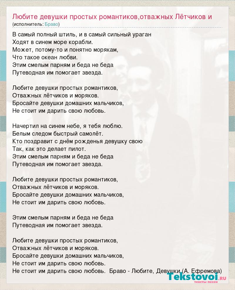 В самый полный штиль, и в самый сильный ураган Ходят в синем море корабли. Может, потому-то и понятно морякам, Что такое океан любви. Этим смелым парням и беда не беда Путеводная им помогает звезда. Любите девушки простых романтиков, Отважных лётчиков и моряков. Бросайте девушки домашних мальчиков, Не стоит им дарить свою любовь. Начертил на синем небе, я тебя люблю. Белым следом быстрый самолёт. Кто поздравит с днём рожденья девушку свою Так, как это делает пилот. Этим смелым парням и беда не беда Путеводная им помогает звезда. Любите девушки простых романтиков, Отважных лётчиков и моряков. Бросайте девушки домашних мальчиков, Не стоит им дарить свою любовь. Этим смелым парням и беда не беда Путеводная им помогает звезда. Любите девушки простых романтиков, Отважных лётчиков и моряков. Бросайте девушки домашних мальчиков, Не стоит им дарить свою любовь. Не стоит им дарить свою любовь. Браво - Любите, Девушки (А. Ефремова)