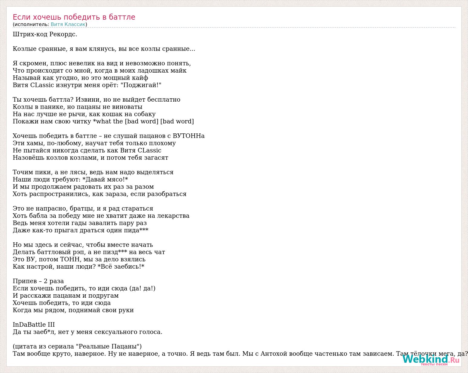 Штрих-код Рекордс. Козлые сранные, я вам клянусь, вы все козлы сранные... Я скромен, плюс невелик на вид и невозможно понять, Что происходит со мной, когда в моих ладошках майк Называй как угодно, но это мощный кайф Витя CLassic изнутри меня орёт: "Поджигай!" Ты хочешь баттла? Извини, но не выйдет бесплатно Козлы в панике, но пацаны не виноваты На нас лучше не рычи, как кошак на собаку Покажи нам свою читку *what the [bad word] [bad word] Хочешь победить в баттле – не слушай пацанов с ВУТОННа Эти хамы, по-любому, научат тебя только плохому Не пытайся никогда сделать как Витя CLassic Назовёшь козлов козлами, и потом тебя загасят Точим пики, а не лясы, ведь нам надо выделяться Наши люди требуют: *Давай мясо!* И мы продолжаем радовать их раз за разом Хоть распространились, как зараза, если разобраться Это не напрасно, братцы, и я рад стараться Хоть бабла за победу мне не хватит даже на лекарства Ведь меня хотели гады завалить пару раз Даже как-то прыгал драться один пида*** Но мы здесь и сейчас, чтобы вместе начать Делать баттловый рэп, а не пизд*** на весь чат Это ВУ, потом ТОНН, мы за дело взялись Как настрой, наши люди? *Всё заебись!* Припев – 2 раза Если хочешь победить, то иди сюда (да! да!) И расскажи пацанам и подругам Хочешь победить, то иди сюда Когда мы рядом, поднимай свои руки InDaBattle III Да ты заеб*л, нет у меня сексуального голоса. (цитата из сериала "Реальные Пацаны") Там вообще круто, наверное. Ну не наверное, а точно. Я ведь там был. Мы с Антохой вообще частенько там зависаем. Там тёлочки мега, да?