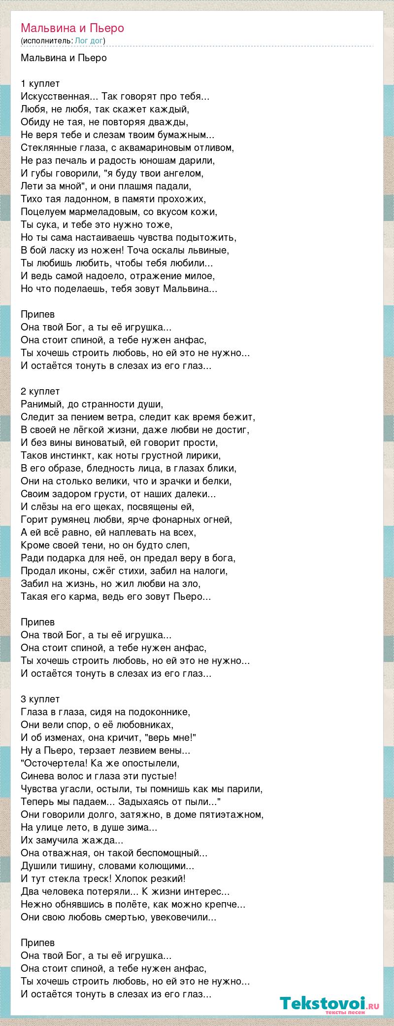 Мальвина и Пьеро 1 куплет Искусственная... Так говорят про тебя... Любя, не любя, так скажет каждый, Обиду не тая, не повторяя дважды, Не веря тебе и слезам твоим бумажным... Стеклянные глаза, с аквамариновым отливом, Не раз печаль и радость юношам дарили, И губы говорили, "я буду твои ангелом, Лети за мной", и они плашмя падали, Тихо тая ладонном, в памяти прохожих, Поцелуем мармеладовым, со вкусом кожи, Ты сука, и тебе это нужно тоже, Но ты сама настаиваешь чувства подытожить, В бой ласку из ножен! Точа оскалы львиные, Ты любишь любить, чтобы тебя любили... И ведь самой надоело, отражение милое, Но что поделаешь, тебя зовут Мальвина... Припев Она твой Бог, а ты её игрушка... Она стоит спиной, а тебе нужен анфас, Ты хочешь строить любовь, но ей это не нужно... И остаётся тонуть в слезах из его глаз... 2 куплет Ранимый, до странности души, Следит за пением ветра, следит как время бежит, В своей не лёгкой жизни, даже любви не достиг, И без вины виноватый, ей говорит прости, Таков инстинкт, как ноты грустной лирики, В его образе, бледность лица, в глазах блики, Они на столько велики, что и зрачки и белки, Своим задором грусти, от наших далеки... И слёзы на его щеках, посвящены ей, Горит румянец любви, ярче фонарных огней, А ей всё равно, ей наплевать на всех, Кроме своей тени, но он будто слеп, Ради подарка для неё, он предал веру в бога, Продал иконы, сжёг стихи, забил на налоги, Забил на жизнь, но жил любви на зло, Такая его карма, ведь его зовут Пьеро... Припев Она твой Бог, а ты её игрушка... Она стоит спиной, а тебе нужен анфас, Ты хочешь строить любовь, но ей это не нужно... И остаётся тонуть в слезах из его глаз... 3 куплет Глаза в глаза, сидя на подоконнике, Они вели спор, о её любовниках, И об изменах, она кричит, "верь мне!" Ну а Пьеро, терзает лезвием вены... "Осточертела! Ка же опостылели, Синева волос и глаза эти пустые! Чувства угасли, остыли, ты помнишь как мы парили, Теперь мы падаем... Задыхаясь от пыли..." Они говорили долго, затяжно, в доме пятиэтажном, На улице лето, в душе зима... Их замучила жажда... Она отважная, он такой беспомощный... Душили тишину, словами колющими... И тут стекла треск! Хлопок резкий! Два человека потеряли... К жизни интерес... Нежно обнявшись в полёте, как можно крепче... Они свою любовь смертью, увековечили... Припев Она твой Бог, а ты её игрушка... Она стоит спиной, а тебе нужен анфас, Ты хочешь строить любовь, но ей это не нужно... И остаётся тонуть в слезах из его глаз...