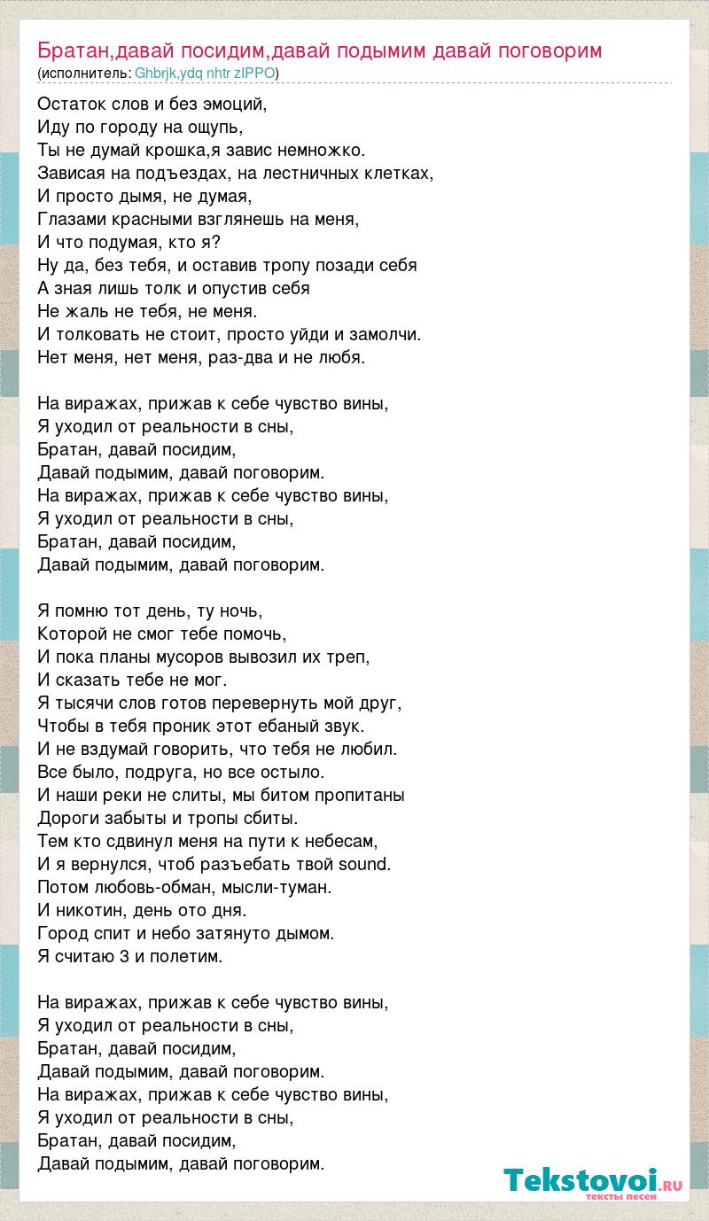 Остаток слов и без эмоций, Иду по городу на ощупь, Ты не думай крошка,я завис немножко. Зависая на подъездах, на лестничных клетках, И просто дымя, не думая, Глазами красными взглянешь на меня, И что подумая, кто я? Ну да, без тебя, и оставив тропу позади себя А зная лишь толк и опустив себя Не жаль не тебя, не меня. И толковать не стоит, просто уйди и замолчи. Нет меня, нет меня, раз-два и не любя. На виражах, прижав к себе чувство вины, Я уходил от реальности в сны, Братан, давай посидим, Давай подымим, давай поговорим. На виражах, прижав к себе чувство вины, Я уходил от реальности в сны, Братан, давай посидим, Давай подымим, давай поговорим. Я помню тот день, ту ночь, Которой не смог тебе помочь, И пока планы мусоров вывозил их треп, И сказать тебе не мог. Я тысячи слов готов перевернуть мой друг, Чтобы в тебя проник этот ебаный звук. И не вздумай говорить, что тебя не любил. Все было, подруга, но все остыло. И наши реки не слиты, мы битом пропитаны Дороги забыты и тропы сбиты. Тем кто сдвинул меня на пути к небесам, И я вернулся, чтоб разъебать твой sound. Потом любовь-обман, мысли-туман. И никотин, день ото дня. Город спит и небо затянуто дымом. Я считаю 3 и полетим. На виражах, прижав к себе чувство вины, Я уходил от реальности в сны, Братан, давай посидим, Давай подымим, давай поговорим. На виражах, прижав к себе чувство вины, Я уходил от реальности в сны, Братан, давай посидим, Давай подымим, давай поговорим.