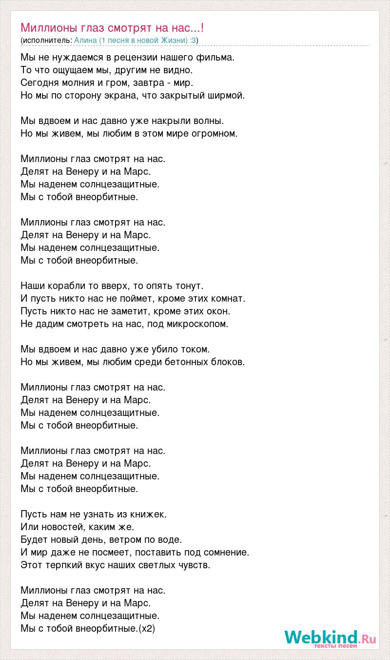 Мы не нуждаемся в рецензии нашего фильма. То что ощущаем мы, другим не видно. Сегодня молния и гром, завтра - мир. Но мы по сторону экрана, что закрытый ширмой. Мы вдвоем и нас давно уже накрыли волны. Но мы живем, мы любим в этом мире огромном. Миллионы глаз смотрят на нас. Делят на Венеру и на Марс. Мы наденем солнцезащитные. Мы с тобой внеорбитные. Миллионы глаз смотрят на нас. Делят на Венеру и на Марс. Мы наденем солнцезащитные. Мы с тобой внеорбитные. Наши корабли то вверх, то опять тонут. И пусть никто нас не поймет, кроме этих комнат. Пусть никто нас не заметит, кроме этих окон. Не дадим смотреть на нас, под микроскопом. Мы вдвоем и нас давно уже убило током. Но мы живем, мы любим среди бетонных блоков. Миллионы глаз смотрят на нас. Делят на Венеру и на Марс. Мы наденем солнцезащитные. Мы с тобой внеорбитные. Миллионы глаз смотрят на нас. Делят на Венеру и на Марс. Мы наденем солнцезащитные. Мы с тобой внеорбитные. Пусть нам не узнать из книжек. Или новостей, каким же. Будет новый день, ветром по воде. И мир даже не посмеет, поставить под сомнение. Этот терпкий вкус наших светлых чувств. Миллионы глаз смотрят на нас. Делят на Венеру и на Марс. Мы наденем солнцезащитные. Мы с тобой внеорбитные.(х2)