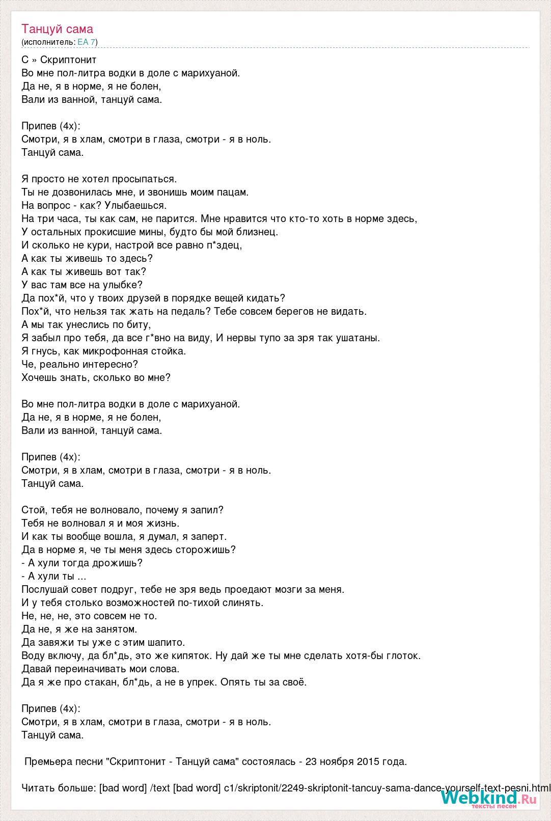 С » Скриптонит Во мне пол-литра водки в доле с марихуаной. Да не, я в норме, я не болен, Вали из ванной, танцуй сама. Припев (4x): Смотри, я в хлам, смотри в глаза, смотри - я в ноль. Танцуй сама. Я просто не хотел просыпаться. Ты не дозвонилась мне, и звонишь моим пацам. На вопрос - как? Улыбаешься. На три часа, ты как сам, не парится. Мне нравится что кто-то хоть в норме здесь, У остальных прокисшие мины, будто бы мой близнец. И сколько не кури, настрой все равно п*здец, А как ты живешь то здесь? А как ты живешь вот так? У вас там все на улыбке? Да пох*й, что у твоих друзей в порядке вещей кидать? Пох*й, что нельзя так жать на педаль? Тебе совсем берегов не видать. А мы так унеслись по биту, Я забыл про тебя, да все г*вно на виду, И нервы тупо за зря так ушатаны. Я гнусь, как микрофонная стойка. Че, реально интересно? Хочешь знать, сколько во мне? Во мне пол-литра водки в доле с марихуаной. Да не, я в норме, я не болен, Вали из ванной, танцуй сама. Припев (4x): Смотри, я в хлам, смотри в глаза, смотри - я в ноль. Танцуй сама. Стой, тебя не волновало, почему я запил? Тебя не волновал я и моя жизнь. И как ты вообще вошла, я думал, я заперт. Да в норме я, че ты меня здесь сторожишь? - А хули тогда дрожишь? - А хули ты ... Послушай совет подруг, тебе не зря ведь проедают мозги за меня. И у тебя столько возможностей по-тихой слинять. Не, не, не, это совсем не то. Да не, я же на занятом. Да завяжи ты уже с этим шапито. Воду включу, да бл*дь, это же кипяток. Ну дай же ты мне сделать хотя-бы глоток. Давай переиначивать мои слова. Да я же про стакан, бл*дь, а не в упрек. Опять ты за своё. Припев (4x): Смотри, я в хлам, смотри в глаза, смотри - я в ноль. Танцуй сама. Премьера песни "Скриптонит - Танцуй сама" состоялась - 23 ноября 2015 года. Читать больше: [bad word] /text [bad word] c1/skriptonit/2249-skriptonit-tancuy-sama-dance-yourself-text-pesni.html