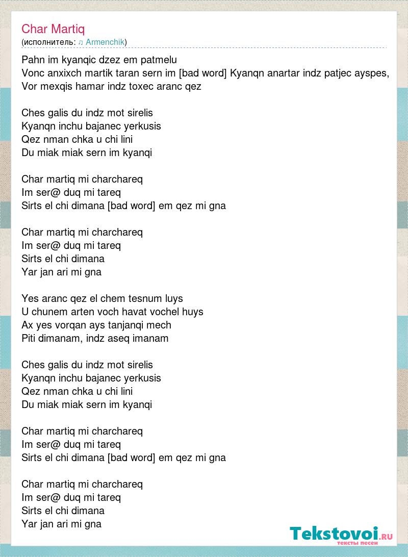 Pahn im kyanqic dzez em patmelu Vonc anxixch martik taran sern im heru Kyanqn anartar indz patjec ayspes, Vor mexqis hamar indz toxec aranc qez Ches galis du indz mot sirelis Kyanqn inchu bajanec yerkusis Qez nman chka u chi lini Du miak miak sern im kyanqi Char martiq mi charchareq Im ser@ duq mi tareq Sirts el chi dimana Xntrum em qez mi gna Char martiq mi charchareq Im ser@ duq mi tareq Sirts el chi dimana Yar jan ari mi gna Yes aranc qez el chem tesnum luys U chunem arten voch havat vochel huys Ax yes vorqan ays tanjanqi mech Piti dimanam, indz aseq imanam Ches galis du indz mot sirelis Kyanqn inchu bajanec yerkusis Qez nman chka u chi lini Du miak miak sern im kyanqi Char martiq mi charchareq Im ser@ duq mi tareq Sirts el chi dimana Xntrum em qez mi gna Char martiq mi charchareq Im ser@ duq mi tareq Sirts el chi dimana Yar jan ari mi gna