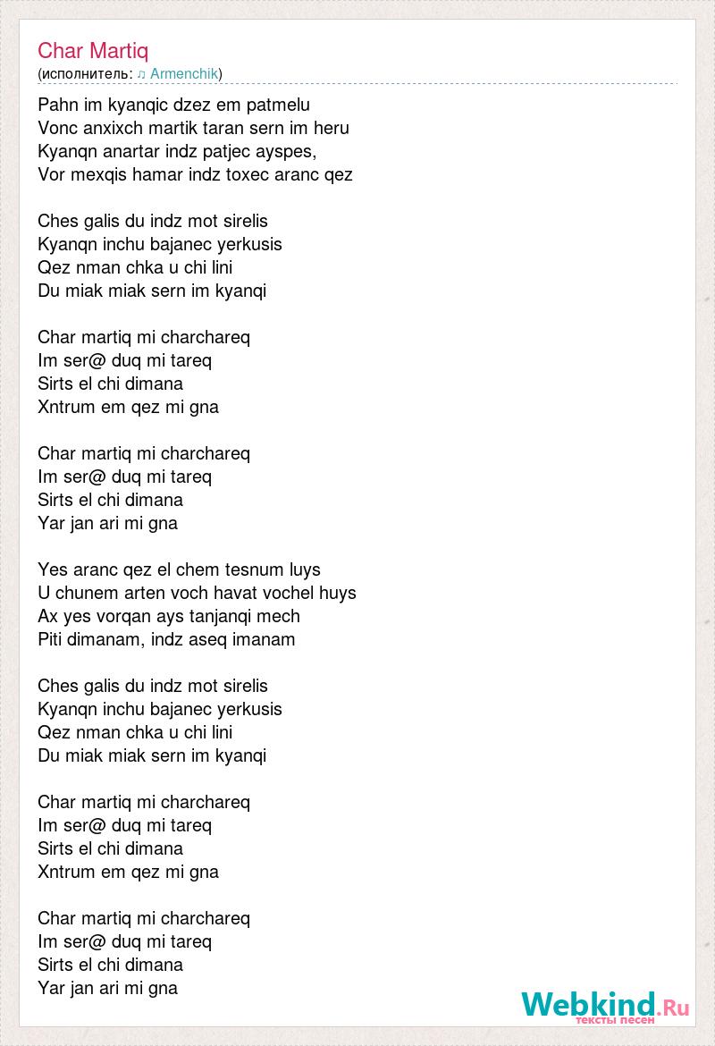 Pahn im kyanqic dzez em patmelu Vonc anxixch martik taran sern im heru Kyanqn anartar indz patjec ayspes, Vor mexqis hamar indz toxec aranc qez Ches galis du indz mot sirelis Kyanqn inchu bajanec yerkusis Qez nman chka u chi lini Du miak miak sern im kyanqi Char martiq mi charchareq Im ser@ duq mi tareq Sirts el chi dimana Xntrum em qez mi gna Char martiq mi charchareq Im ser@ duq mi tareq Sirts el chi dimana Yar jan ari mi gna Yes aranc qez el chem tesnum luys U chunem arten voch havat vochel huys Ax yes vorqan ays tanjanqi mech Piti dimanam, indz aseq imanam Ches galis du indz mot sirelis Kyanqn inchu bajanec yerkusis Qez nman chka u chi lini Du miak miak sern im kyanqi Char martiq mi charchareq Im ser@ duq mi tareq Sirts el chi dimana Xntrum em qez mi gna Char martiq mi charchareq Im ser@ duq mi tareq Sirts el chi dimana Yar jan ari mi gna