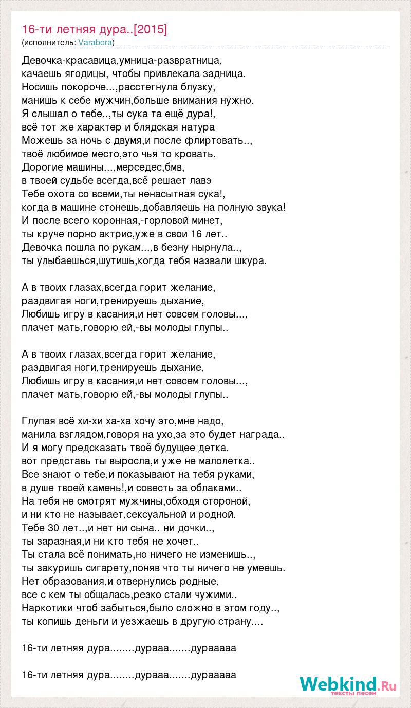 Девочка-красавица,умница-развратница, качаешь ягодицы, чтобы привлекала задница. Носишь покороче...,расстегнула блузку, манишь к себе мужчин,больше внимания нужно. Я слышал о тебе..,ты сука та ещё дура!, всё тот же характер и блядская натура Можешь за ночь с двумя,и после флиртовать.., твоё любимое место,это чья то кровать. Дорогие машины...,мерседес,бмв, в твоей судьбе всегда,всё решает лавэ Тебе охота со всеми,ты ненасытная сука!, когда в машине стонешь,добавляешь на полную звука! И после всего коронная,-горловой минет, ты круче порно актрис,уже в свои 16 лет.. Девочка пошла по рукам...,в безну нырнула.., ты улыбаешься,шутишь,когда тебя назвали шкура. А в твоих глазах,всегда горит желание, раздвигая ноги,тренируешь дыхание, Любишь игру в касания,и нет совсем головы..., плачет мать,говорю ей,-вы молоды глупы.. А в твоих глазах,всегда горит желание, раздвигая ноги,тренируешь дыхание, Любишь игру в касания,и нет совсем головы..., плачет мать,говорю ей,-вы молоды глупы.. Глупая всё хи-хи ха-ха хочу это,мне надо, манила взглядом,говоря на ухо,за это будет награда.. И я могу предсказать твоё будущее детка. вот представь ты выросла,и уже не малолетка.. Все знают о тебе,и показывают на тебя руками, в душе твоей камень!,и совесть за облаками.. На тебя не смотрят мужчины,обходя стороной, и ни кто не называет,сексуальной и родной. Тебе 30 лет..,и нет ни сына.. ни дочки.., ты заразная,и ни кто тебя не хочет.. Ты стала всё понимать,но ничего не изменишь.., ты закуришь сигарету,поняв что ты ничего не умеешь. Нет образования,и отвернулись родные, все с кем ты общалась,резко стали чужими.. Наркотики чтоб забыться,было сложно в этом году.., ты копишь деньги и уезжаешь в другую страну.... 16-ти летняя дура........дурааа.......дурааааа 16-ти летняя дура........дурааа.......дурааааа