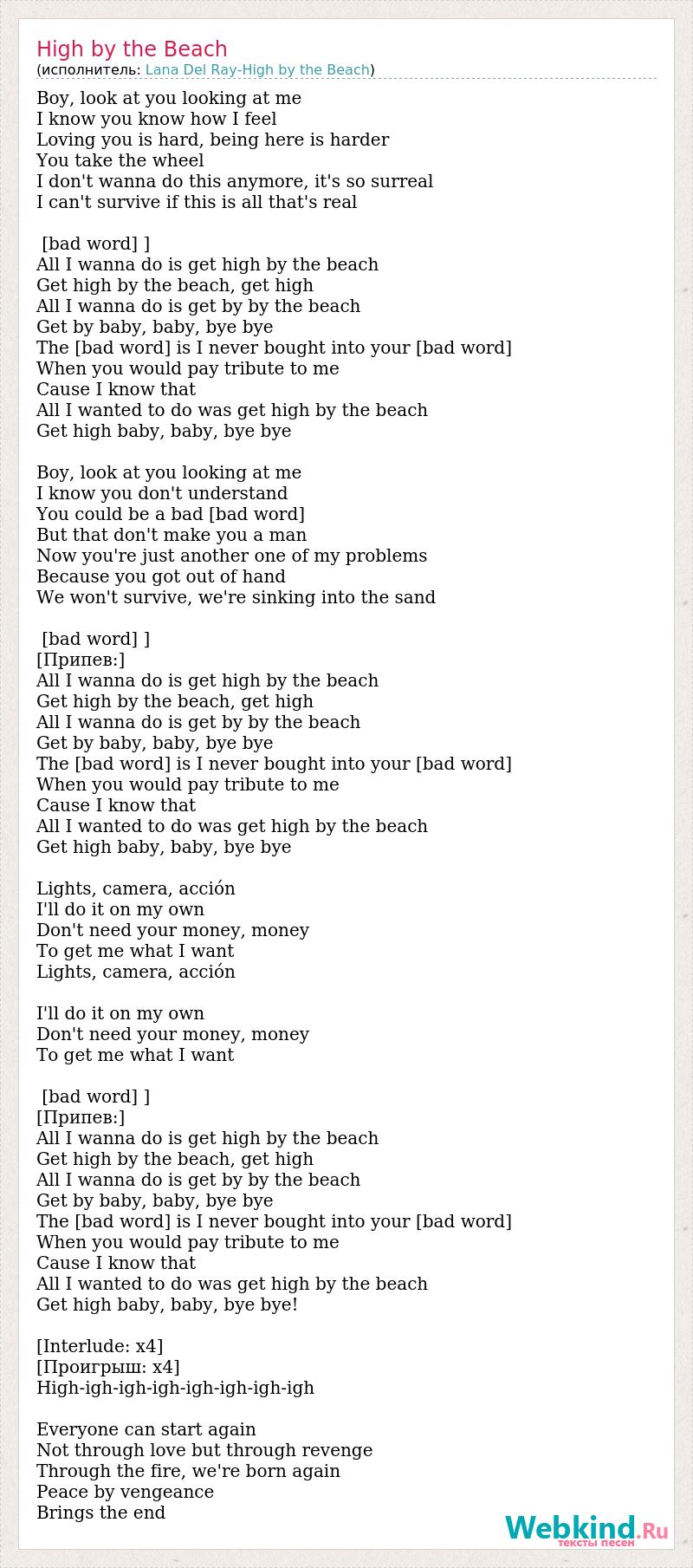Boy, look at you looking at me I know you know how I feel Loving you is hard, being here is harder You take the wheel I don't wanna do this anymore, it's so surreal I can't survive if this is all that's real [bad word] ] All I wanna do is get high by the beach Get high by the beach, get high All I wanna do is get by by the beach Get by baby, baby, bye bye The [bad word] is I never bought into your [bad word] When you would pay tribute to me Cause I know that All I wanted to do was get high by the beach Get high baby, baby, bye bye Boy, look at you looking at me I know you don't understand You could be a bad [bad word] But that don't make you a man Now you're just another one of my problems Because you got out of hand We won't survive, we're sinking into the sand [bad word] ] [Припев:] All I wanna do is get high by the beach Get high by the beach, get high All I wanna do is get by by the beach Get by baby, baby, bye bye The [bad word] is I never bought into your [bad word] When you would pay tribute to me Cause I know that All I wanted to do was get high by the beach Get high baby, baby, bye bye Lights, camera, acción I'll do it on my own Don't need your money, money To get me what I want Lights, camera, acción I'll do it on my own Don't need your money, money To get me what I want [bad word] ] [Припев:] All I wanna do is get high by the beach Get high by the beach, get high All I wanna do is get by by the beach Get by baby, baby, bye bye The [bad word] is I never bought into your [bad word] When you would pay tribute to me Cause I know that All I wanted to do was get high by the beach Get high baby, baby, bye bye! [Interlude: x4] [Проигрыш: x4] High-igh-igh-igh-igh-igh-igh-igh Everyone can start again Not through love but through revenge Through the fire, we're born again Peace by vengeance Brings the end