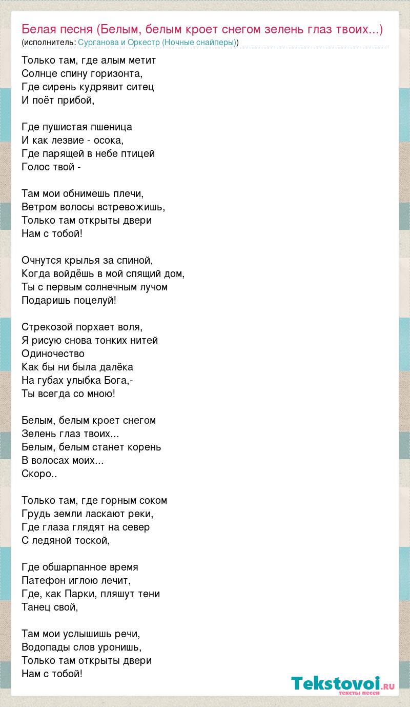 Главная→Исполнители→Сурганова и Оркестр (Ночные снайперы)→Белая песня (Белым, белым кроет снегом зелень глаз твоих...)